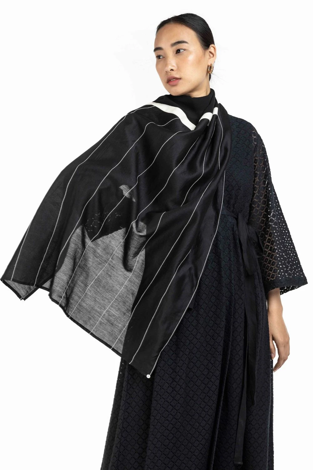 Add an understated elegance & luxury to your looks with this chanderi & georgette scarf in black. It is uplifted with stripe embroidery detail in ivory.