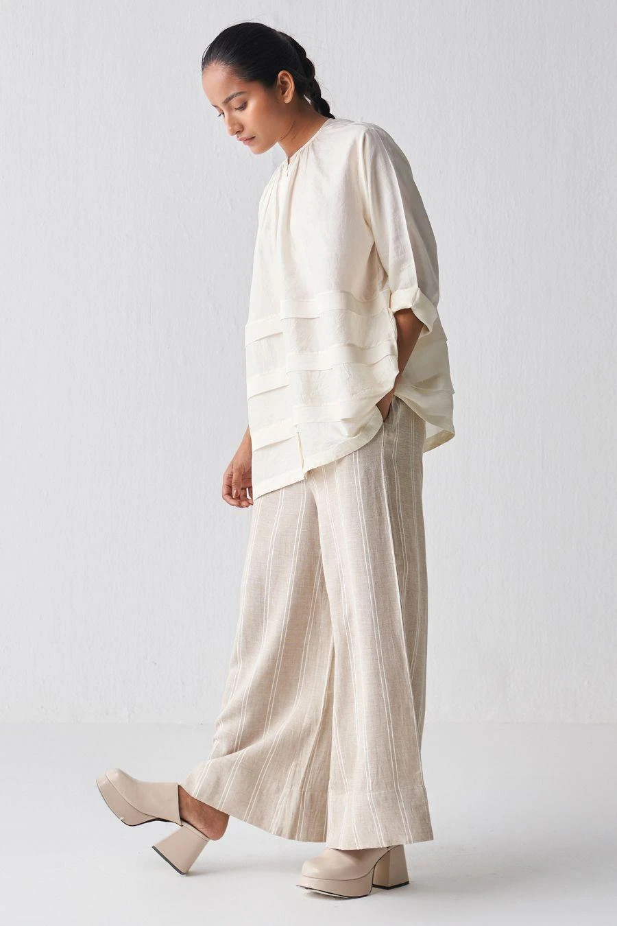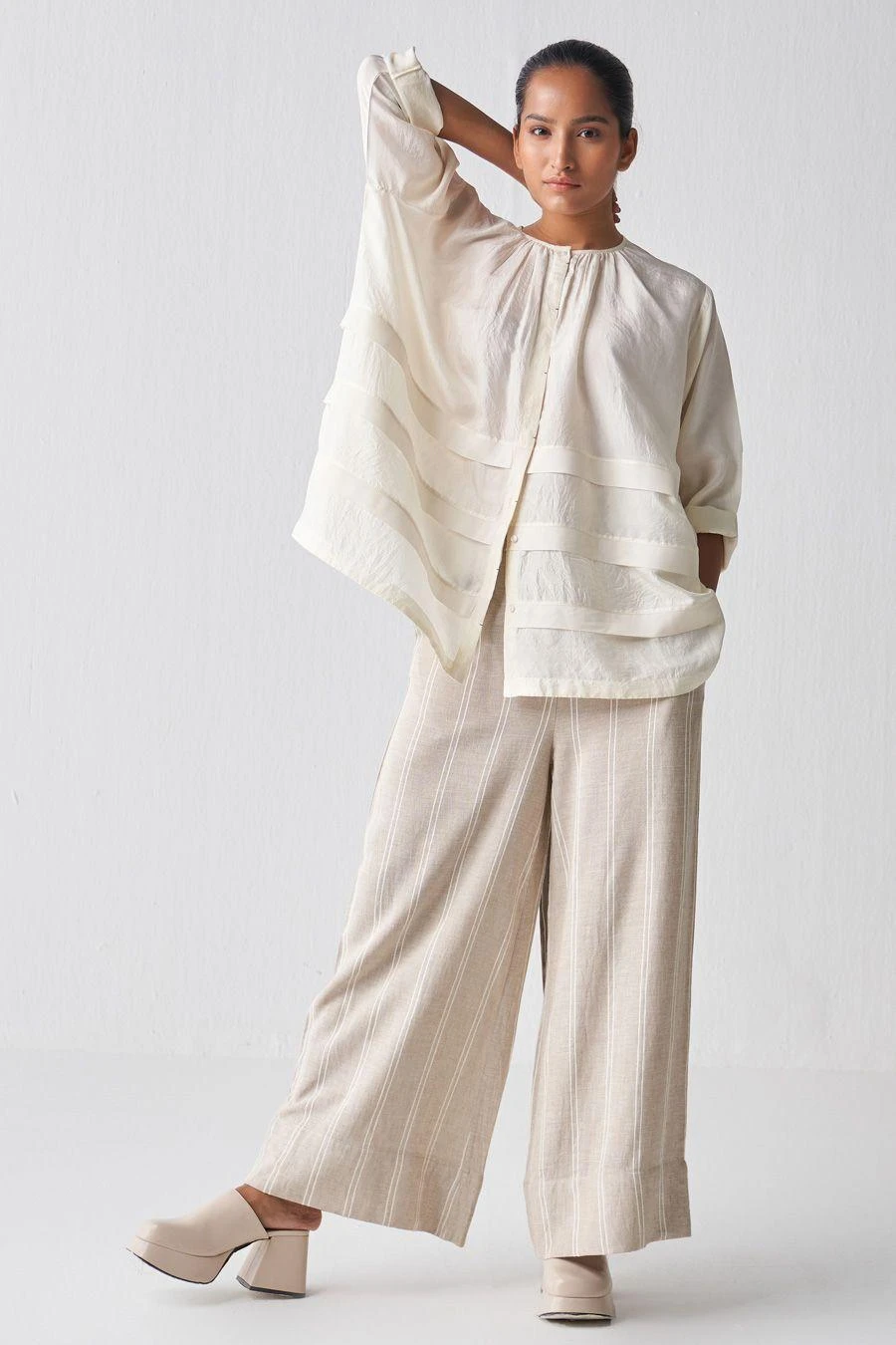 This co-ord set falls in the realm of luxe minimalism. Crafted in silk, this set features a relaxed fit pleated top paired with handwoven cotton broad bottoms. Add a pair of hoop earrings & a stack of bracelets to complete the look.