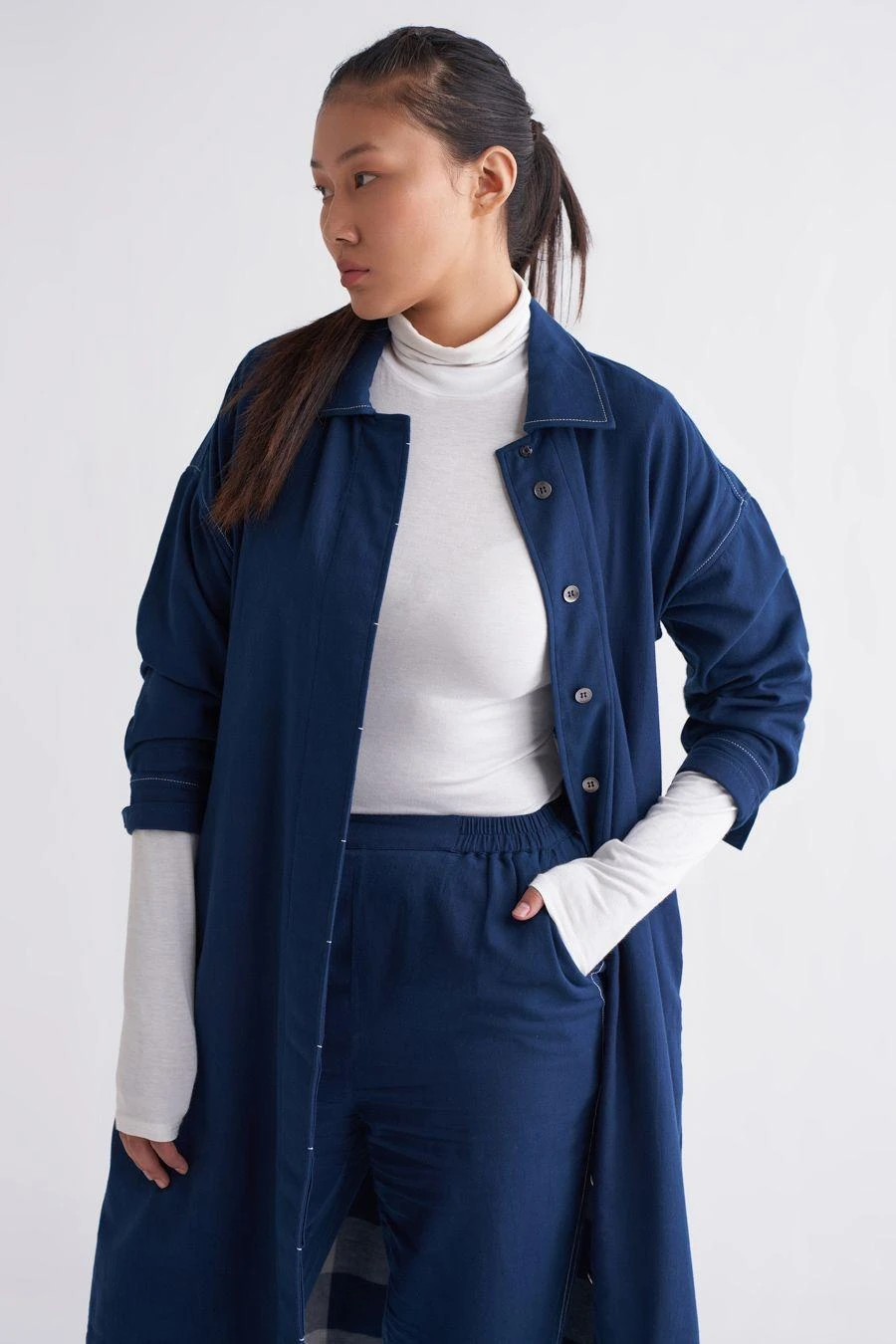 Three’s AW collection is an amalgamation of angular architectural cuts, neutral tines, cut-out backs and a play of stripes. This set features a U-hem, checkered jacket paired with narrow bottoms with side inseam pockets.