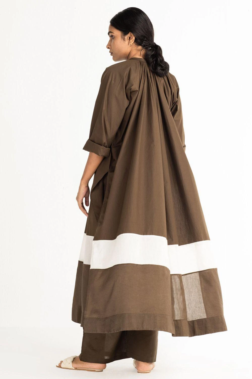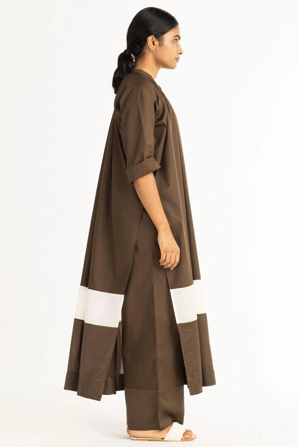 Amp up your contemporary closet with this airy olive co-ord set cut in crisp cotton poplin. It features a long panel tunic with gathered neck and high side slits, paired with wide leg pants. Style it with a pair of matte gold hoops.