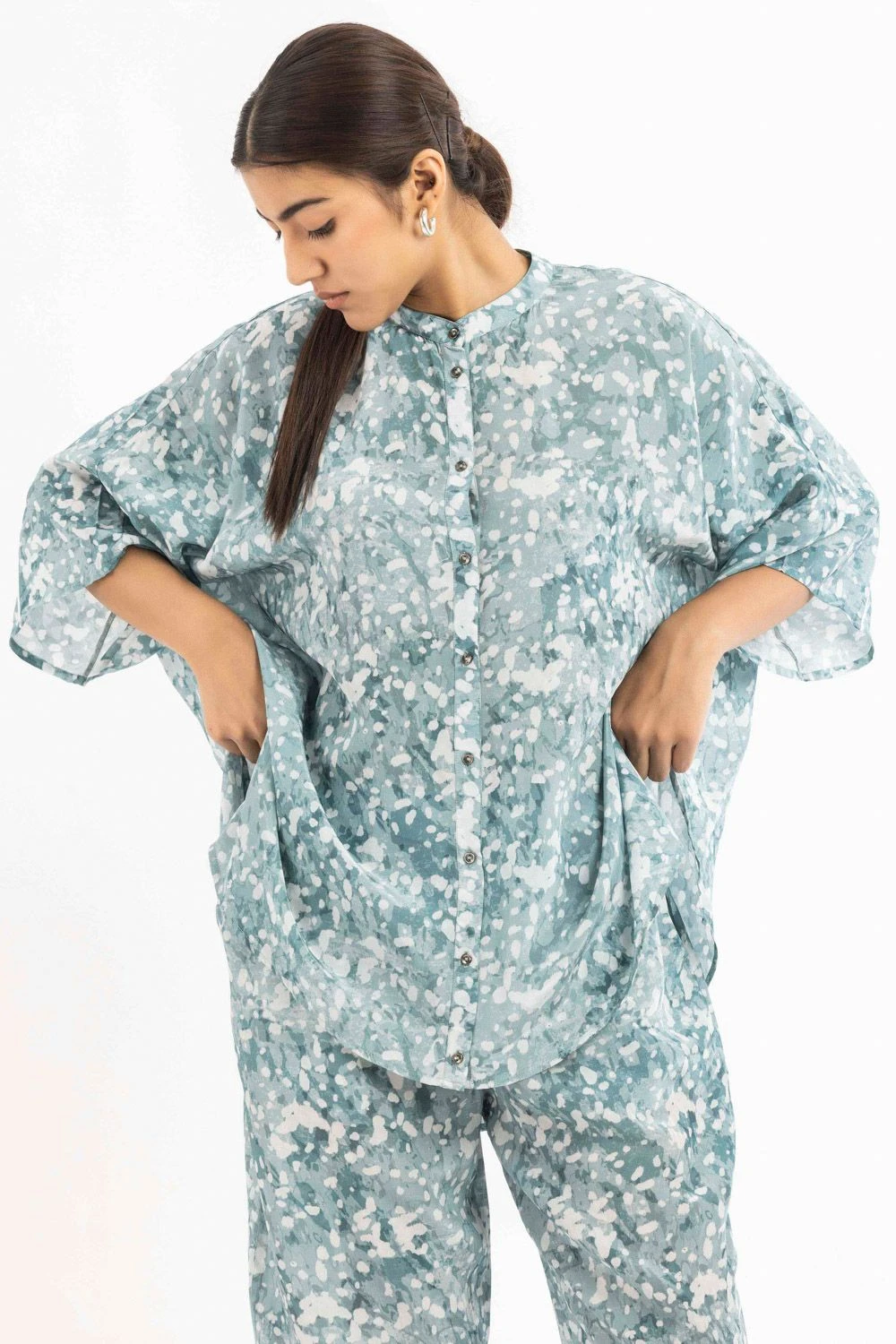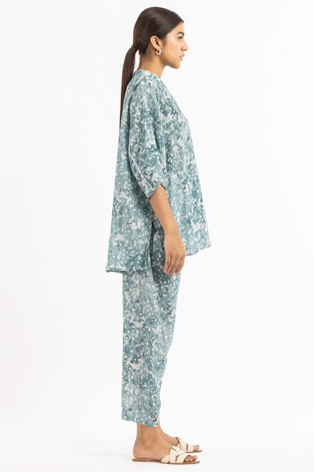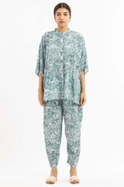 These soft blue narrow pants are perfect to beat the heat. It is cut in printed silk crepe in a loose fit with side inseam pockets. You can team it up with a matching shirt from the collection.