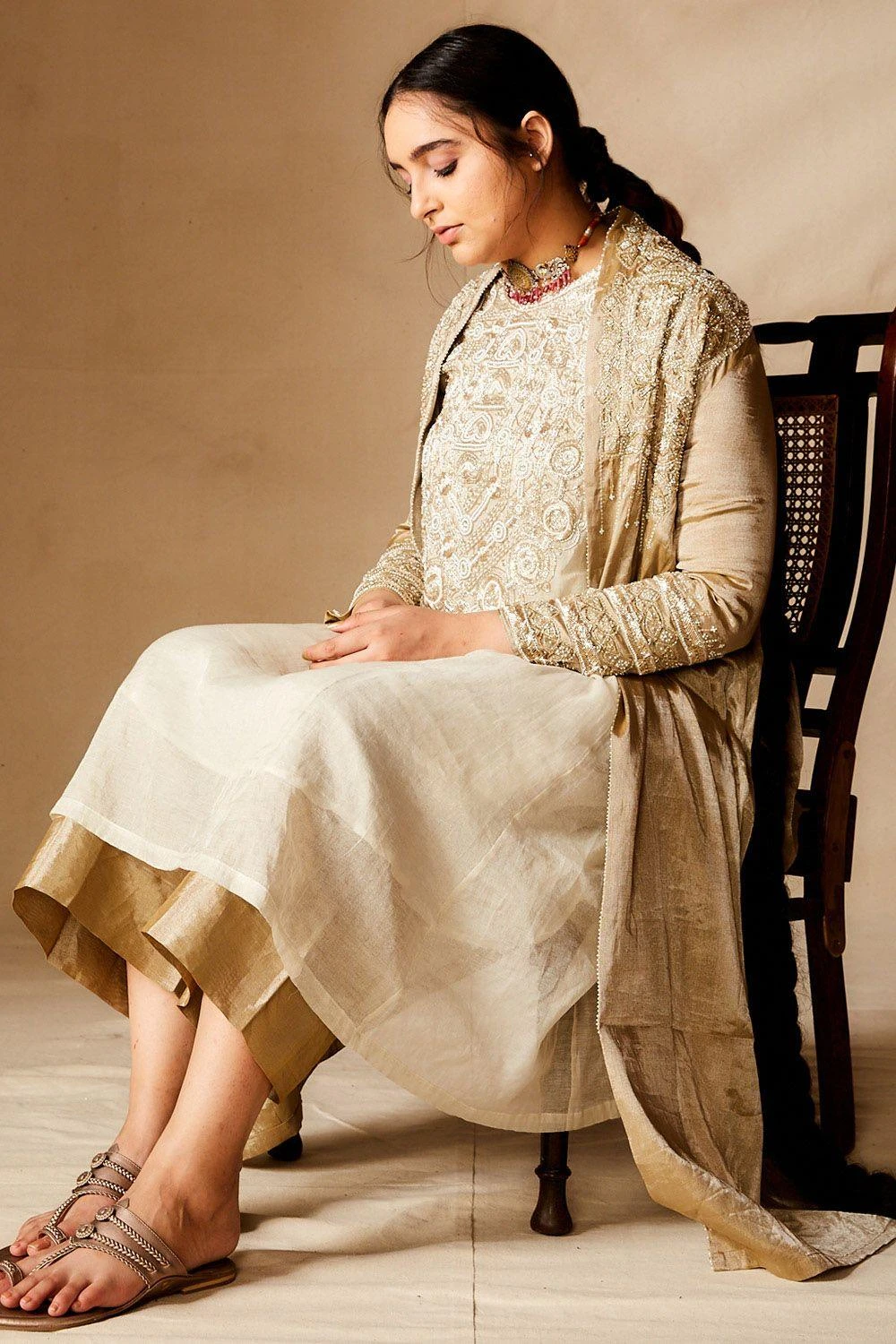 This asymmetric ivory kurta is set in a sumptuous fabric & enhanced with extensive zari embroidery on the yoke. You can add a pair of golden pants from Tilla & a sheer dupatta with this look.