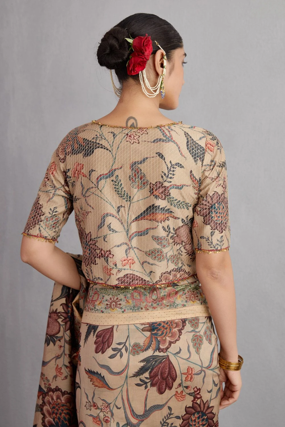 Subtle & sophisticated, this chandan enakshi blouse is cut in handwoven chanderi & pure silk organza. It features a front button down placket. It will perfectly complement the coordinating enakshi sari from the collection.