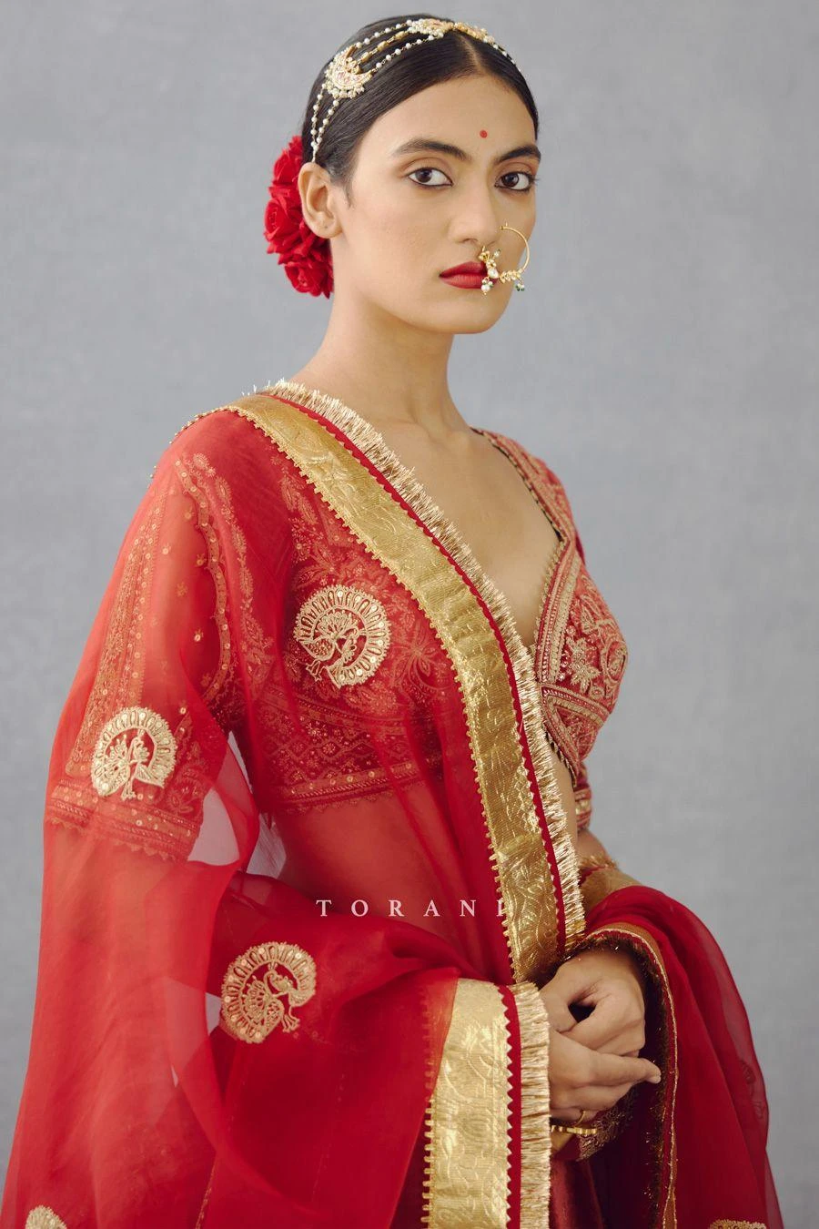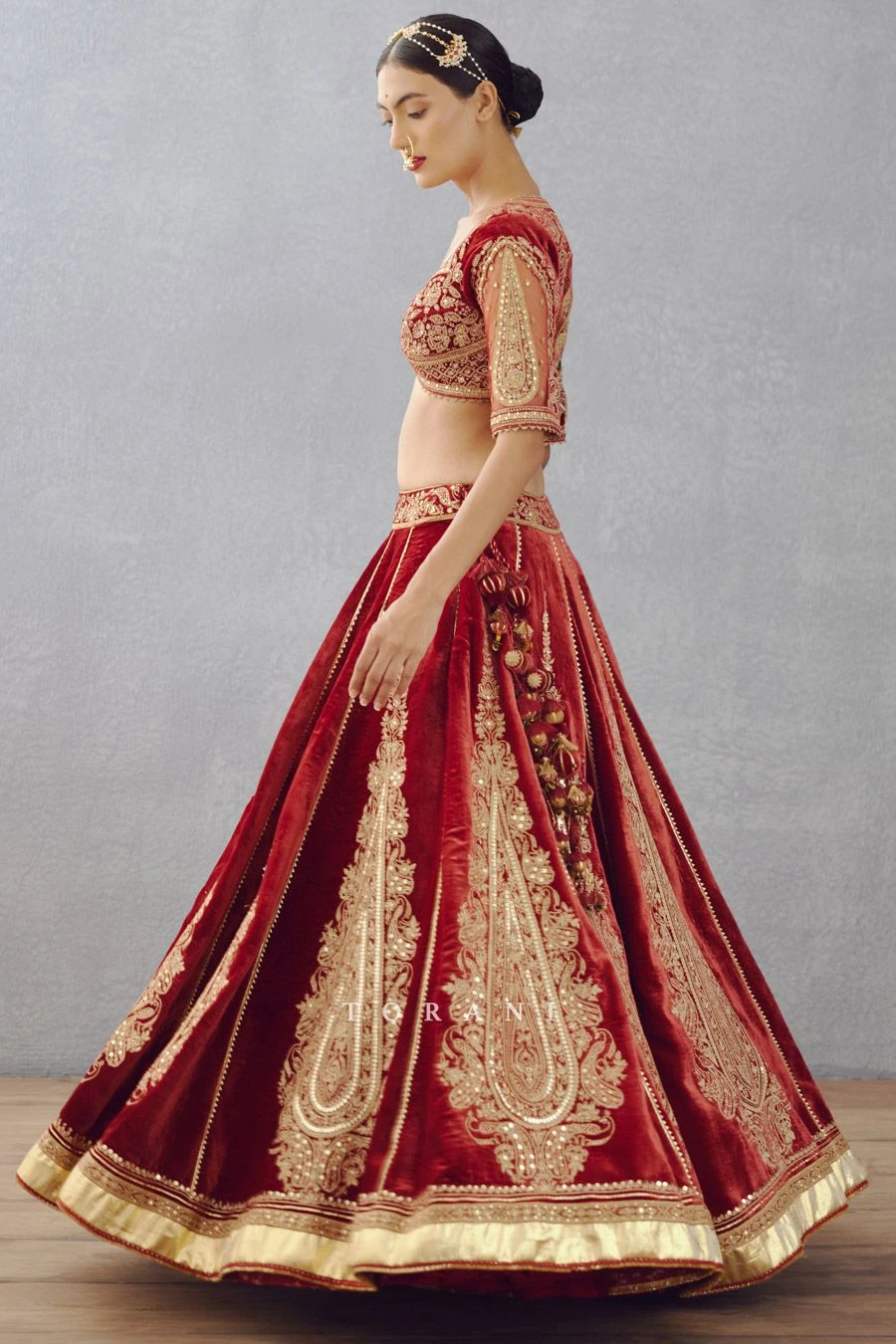 Add this ethereal ensemble to your wedding trousseau for an elegant engagement look. Crafted in silk velvet, this set features a gota embroidered with golden thread work lehenga with a jaal embroidered blouse & dupatta.