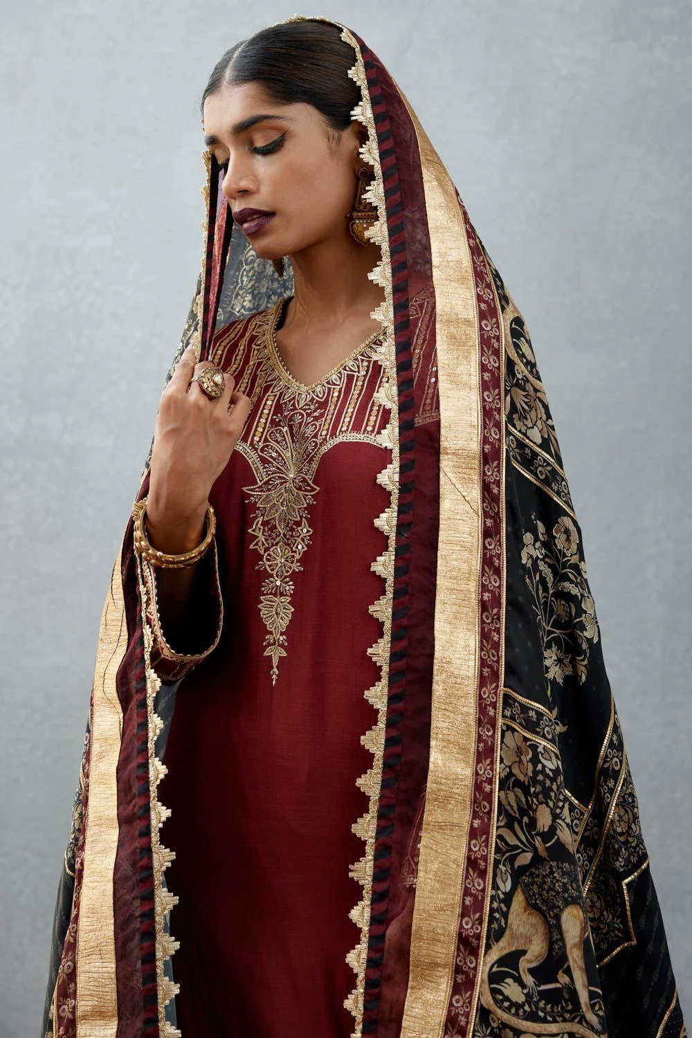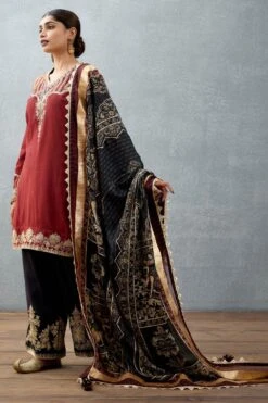 This printed kurta set will see you through the upcoming wedding season. Crafted in slub silk, this set comes with a bhagalpuri print kurta & pants paired with a silk organza dupatta. Style it with a pair of polki earrings to complete the look.