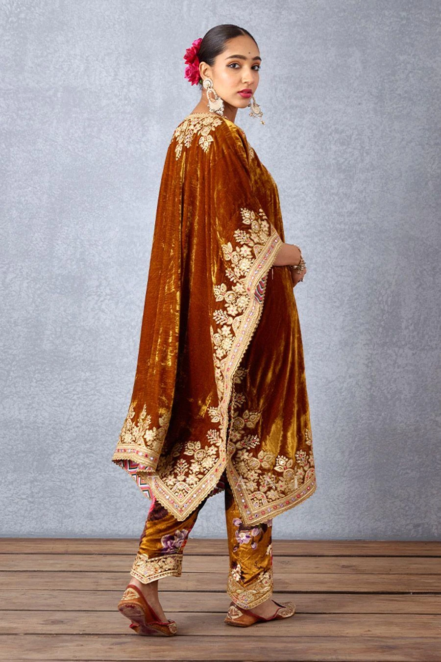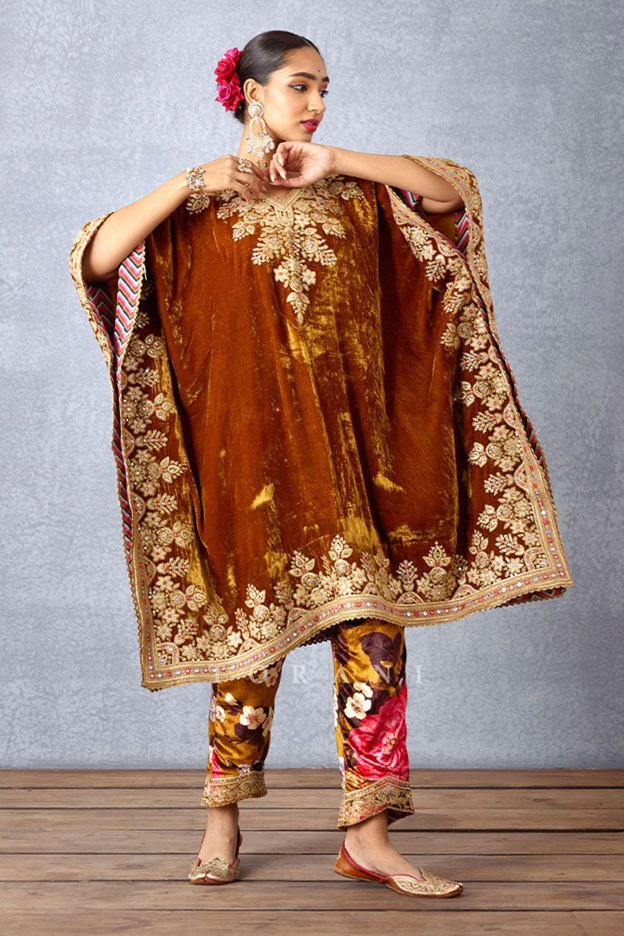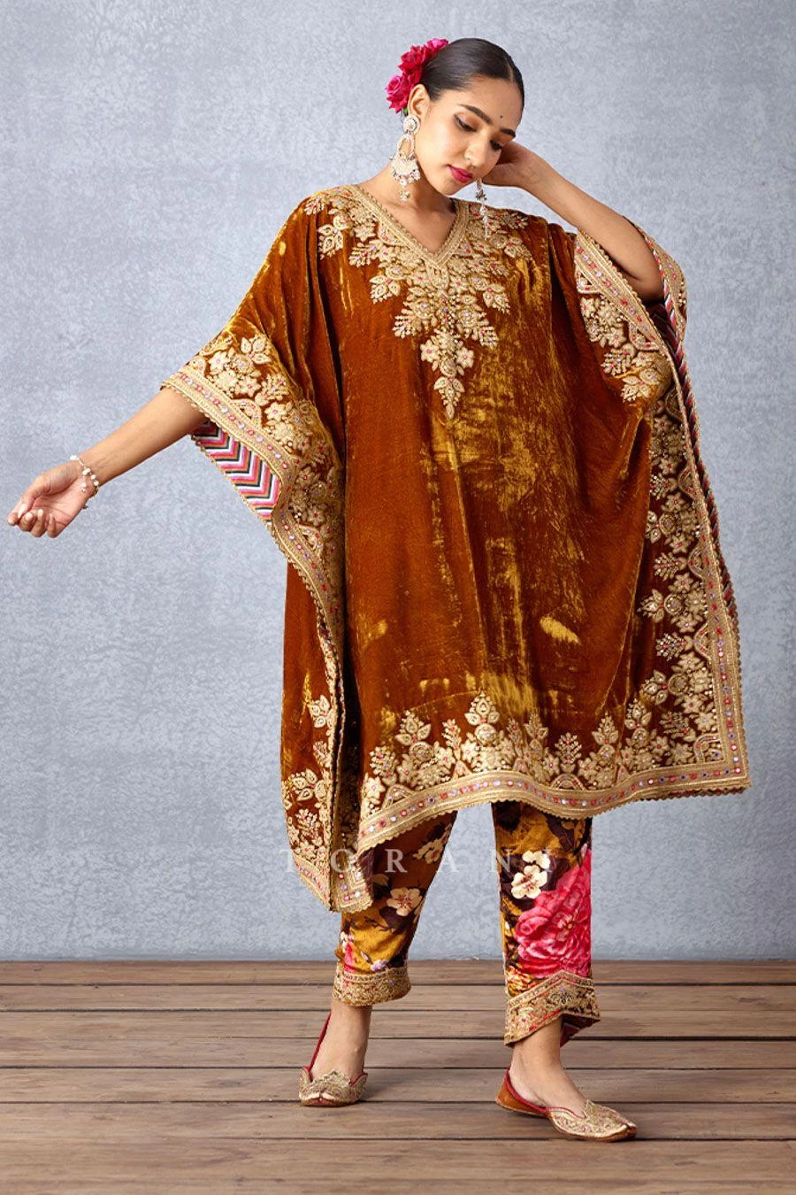 The perfect amalgamation of style and comfort, this kaftan set works across occasions. Crafted in silk velvet, this set features a gota and zari embroidered kaftan paired with floral pants. Add a pair of statement earrings to complete the look.