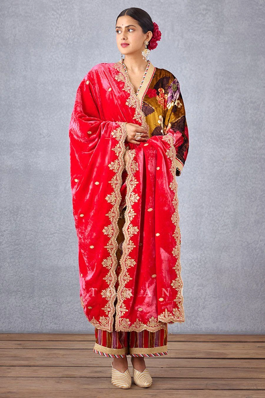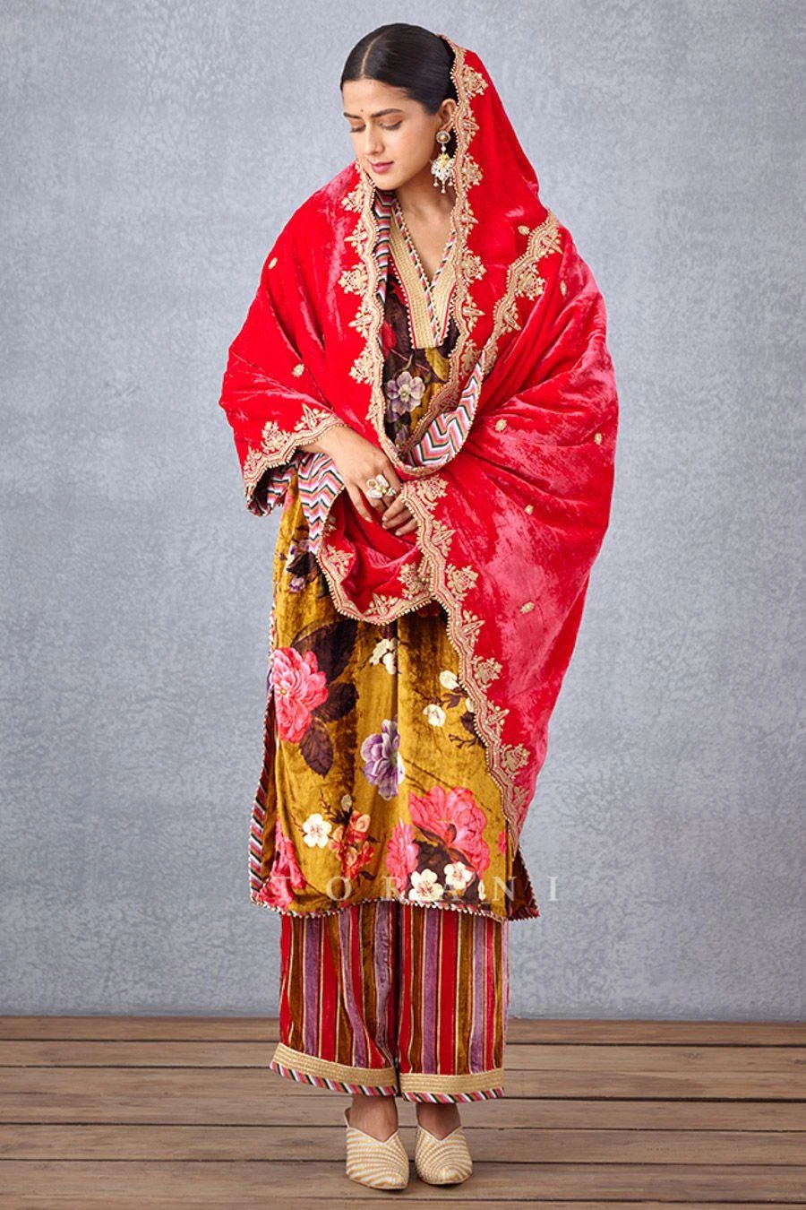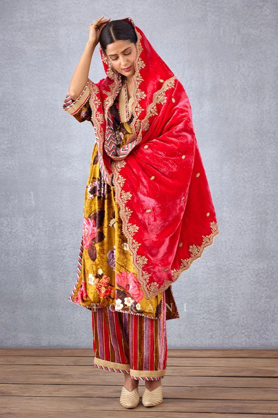 Take your layering game a notch higher with this doshala. Crafted in silk velvet, this dupatta features a floral print with zari and gota embroidered details.