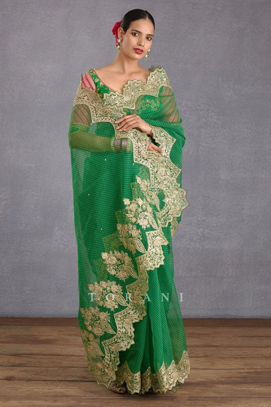 The perfect amalgamation of style and comfort, this sari set works across occasions. Crafted in silk organza, this set features a gota work sari paired with bhagalpuri printed blouse. Add a pair of statement earrings to complete the look.