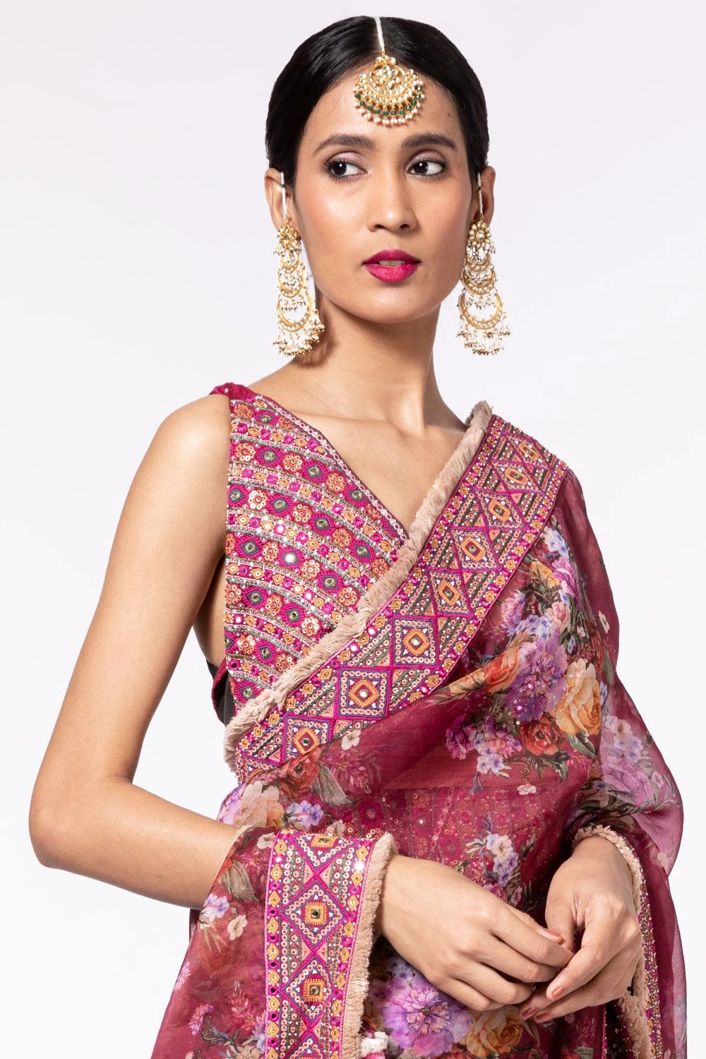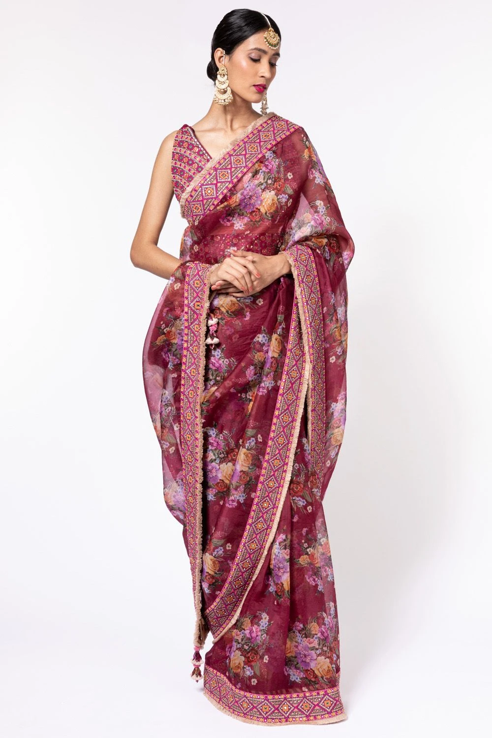 Timeless & elegant, this ruby red floral sari is a classic festive piece. It is cut in pure silk organza and accentuated with cotton silk embroidered border. It comes with a blouse piece.