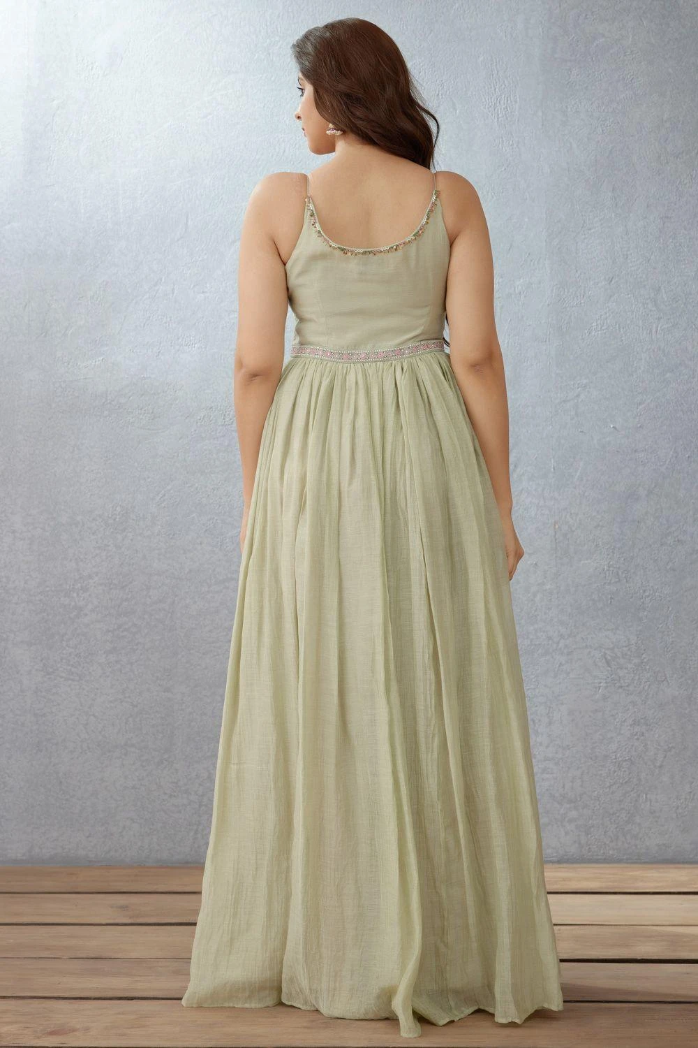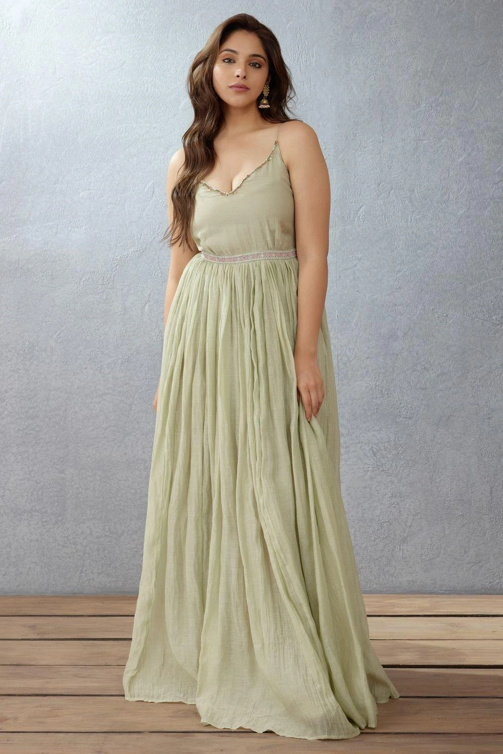 Swap your dupattas for cape this festive season. Cut in chanderi and silk organza, this set features a chintz printed sheer jacket paired with a gathered dress. Style this set with dainty jewellery to complete the look.