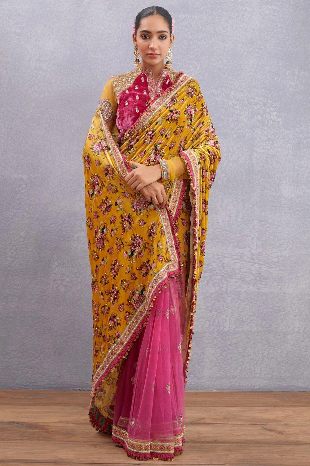 Grace your festivities in ultimate royalty in this yellow & pink sari. It is engineered in half silk velvet & half net, adorned with hand embroidery. Team it up with a matching blouse from the collection.