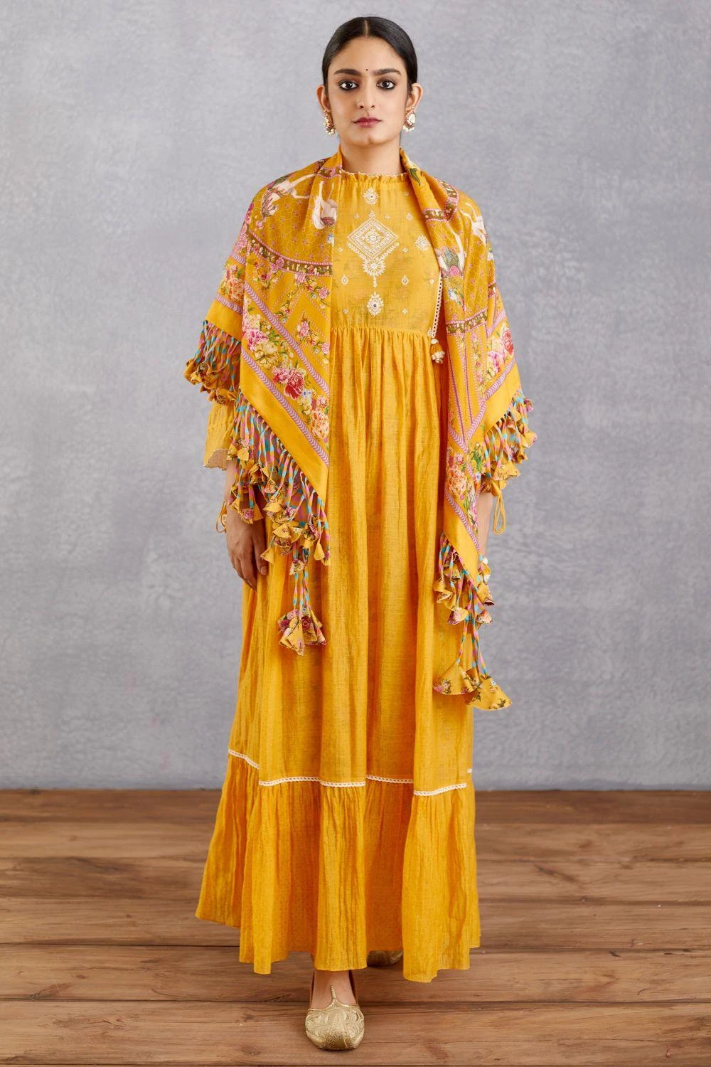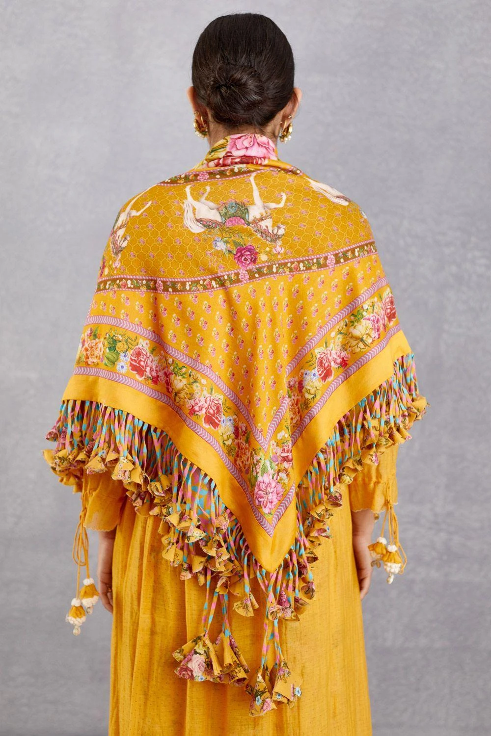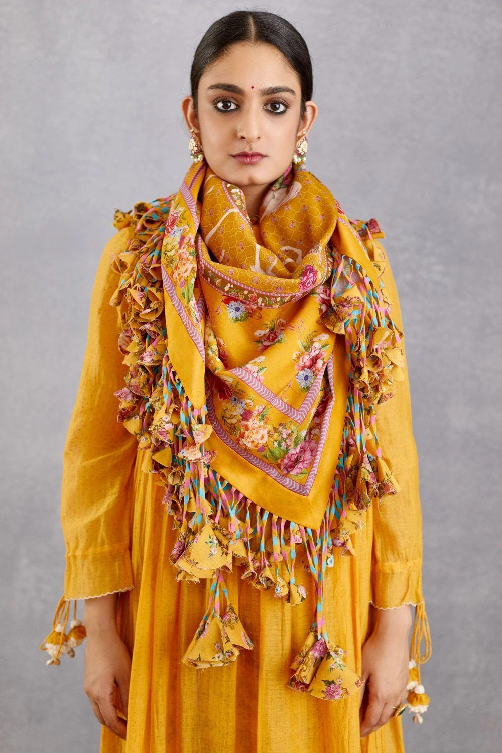 This vibrant handwoven chanderi floral printed scarf is highlighted with delicate fringe details. Style this piece with a kurta set or dress for a playful & summery look.