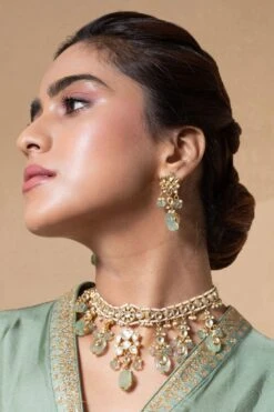 Embrace the allure of this kundan necklace set. Handcrafted with meticulous attention to detail, this opulent ensemble exudes regal elegance. The glistening kundan stones, set in a radiant gold frame, capture the essence of luxury & tradition.