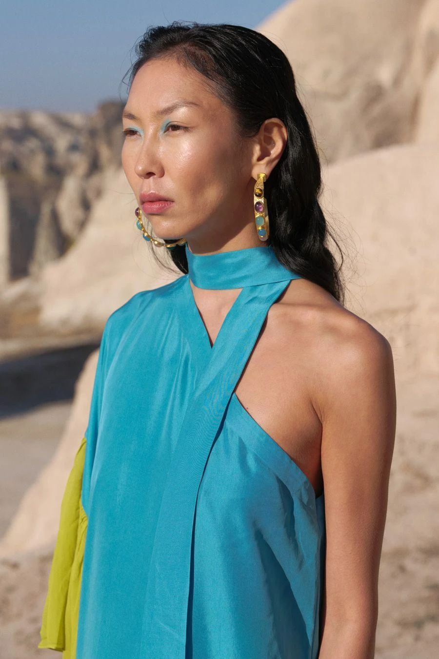 Add a layer of statement and glamour to your resort getaways with this maxi dress. Crafted in silk and georgette, this dual tone one-shoulder dress features frill detailing. Add a pair of dangler earrings to complete the look.