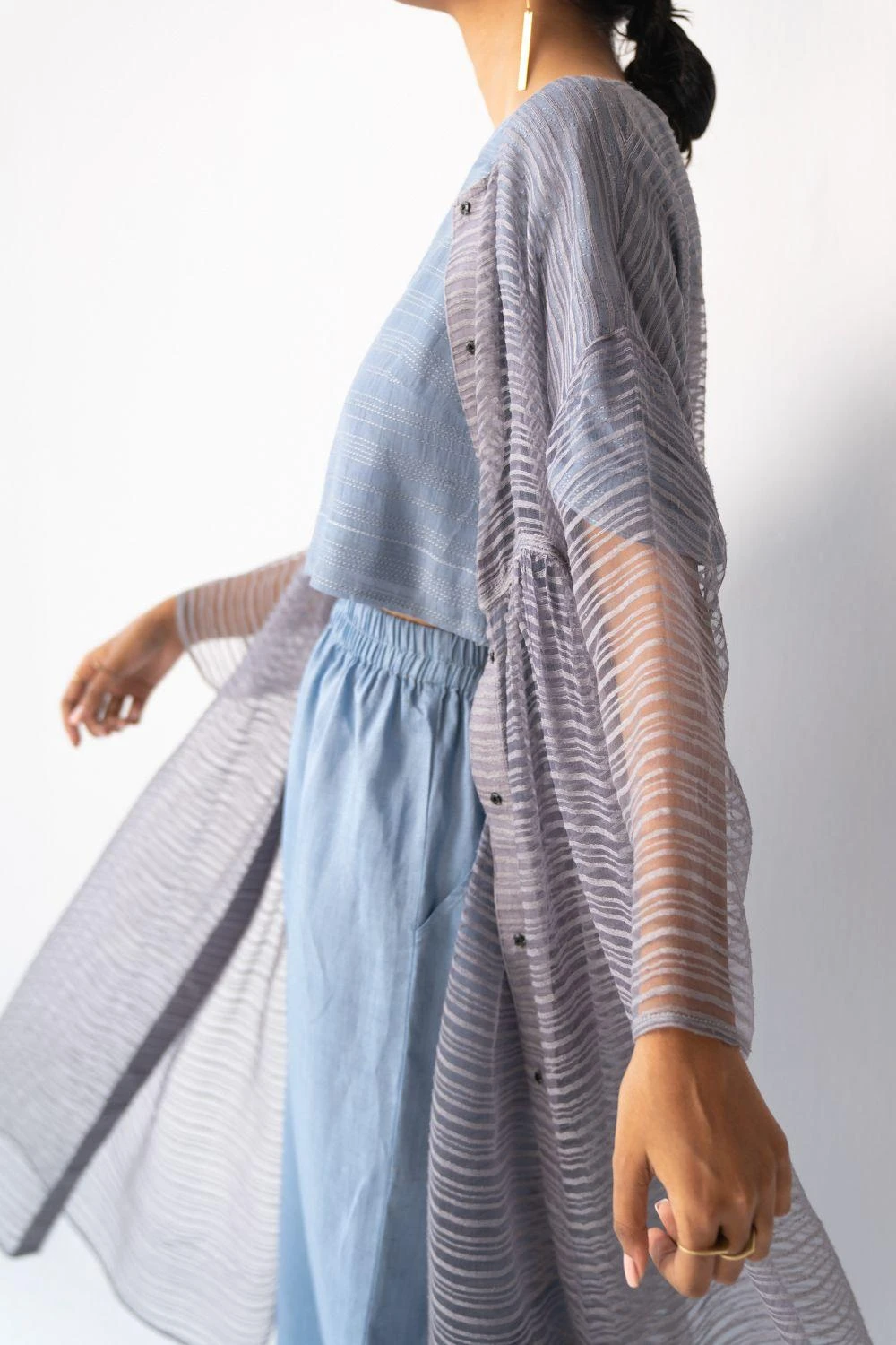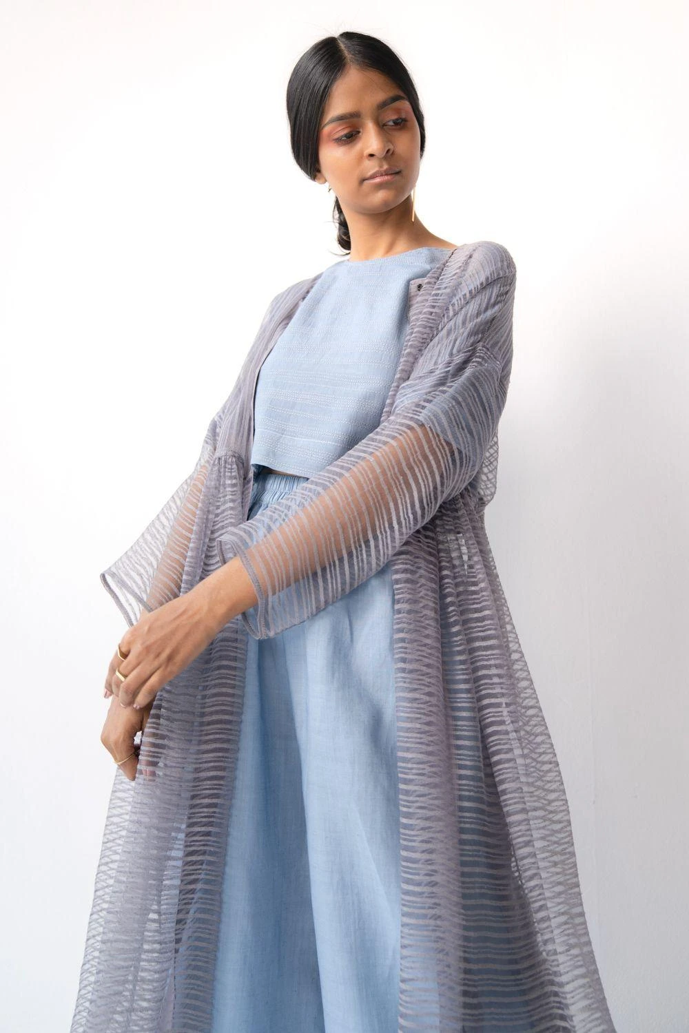 Enhance your look with understated elegance in this grey linen noil long overlay. It is cut in a flowy & relaxed silhouette. Style it with an A-line dress or kurta to add a delicate layer to your looks.