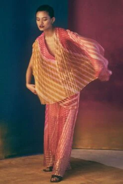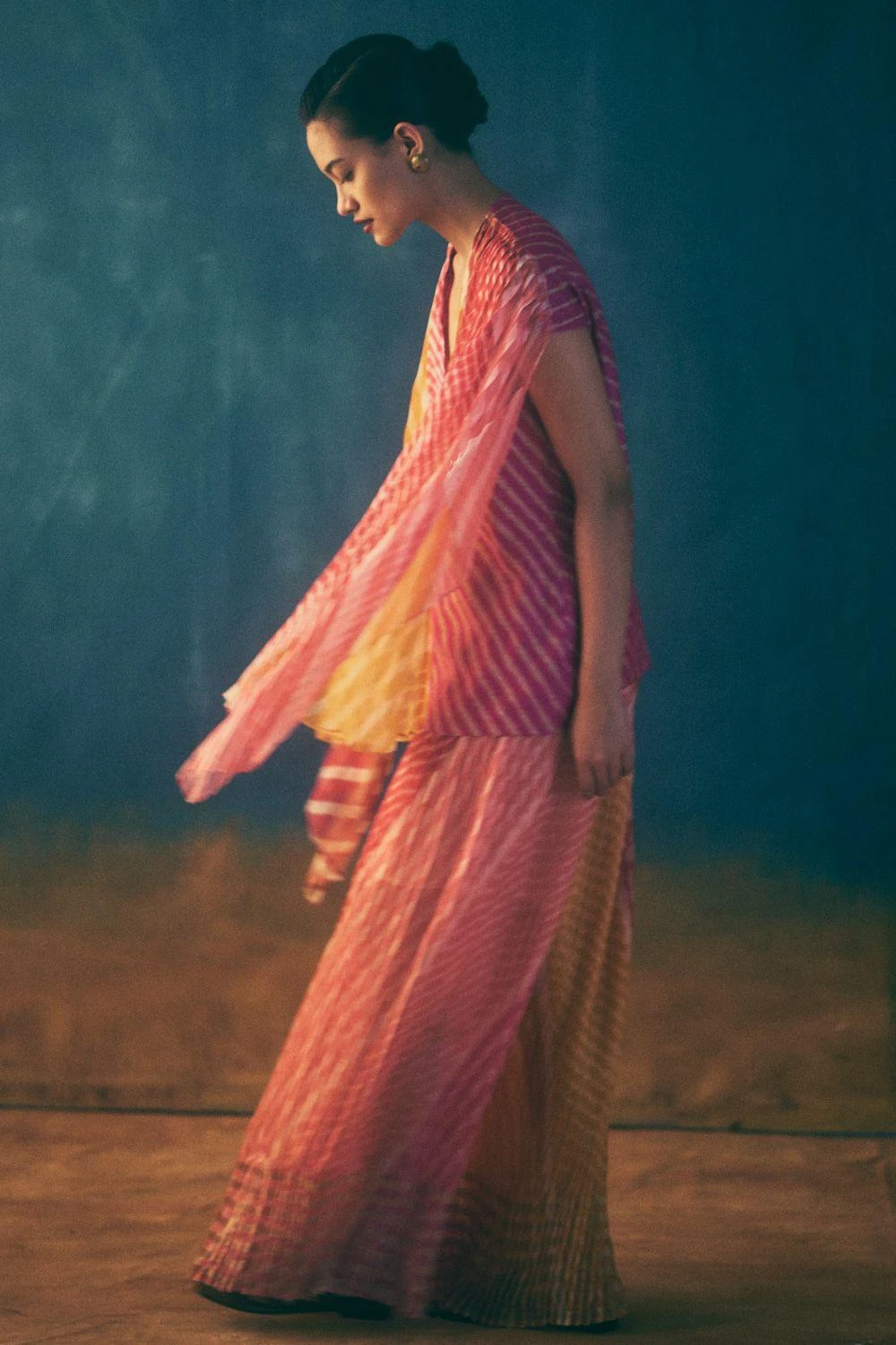 Elevate elegance with these hand micro-pleated wide pants. Crafted from zari silk kota doria, these pants feature intricate kantha stitches, showcasing the artistry that holds the hand tie-dyed leheriya design.