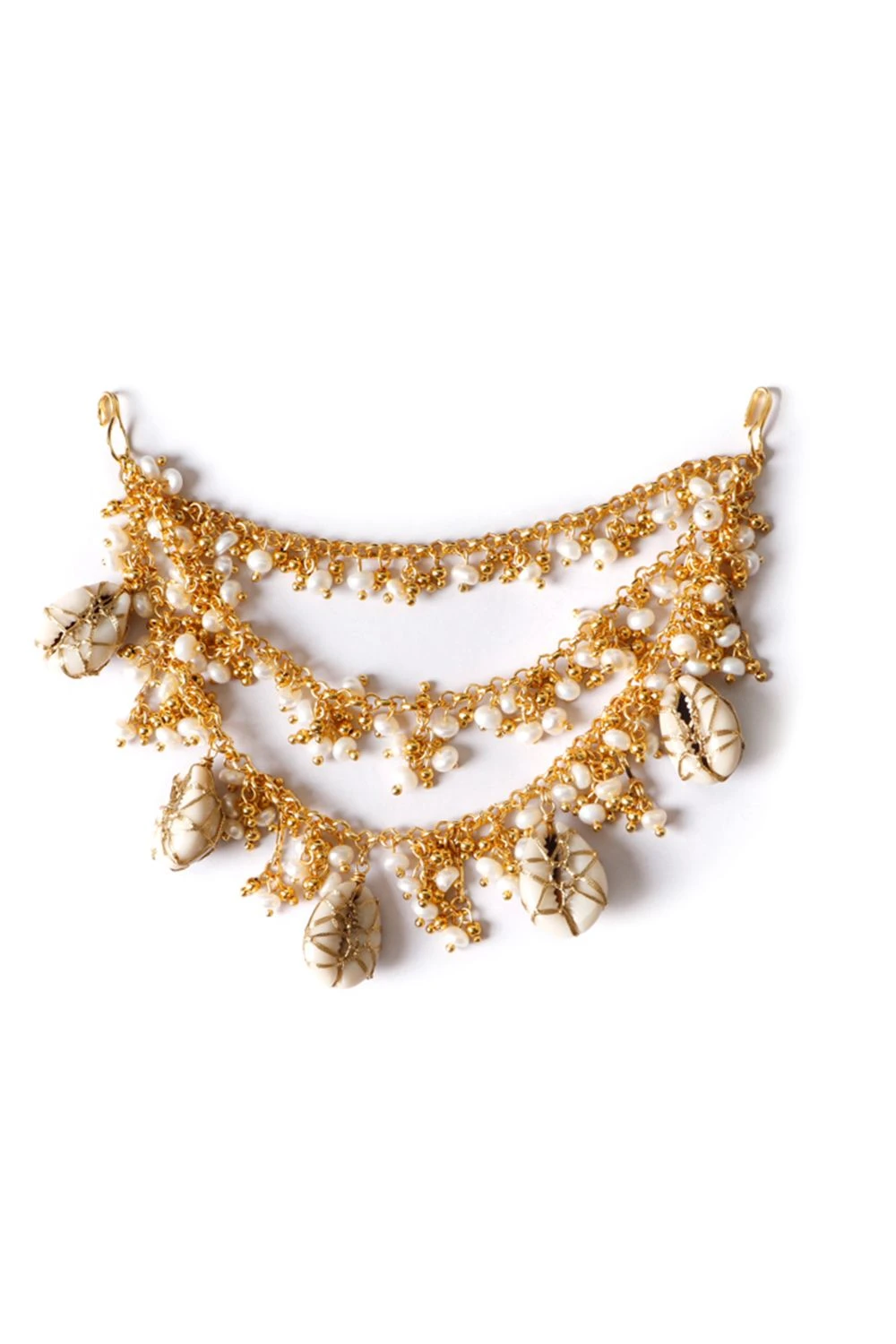 Accentuate your festive looks with this Anvi pearl hair accessory. Made with three chains that hang loosely below each other with shells dangling at the bottom, this hair accessory is a must have for your jewellery box.