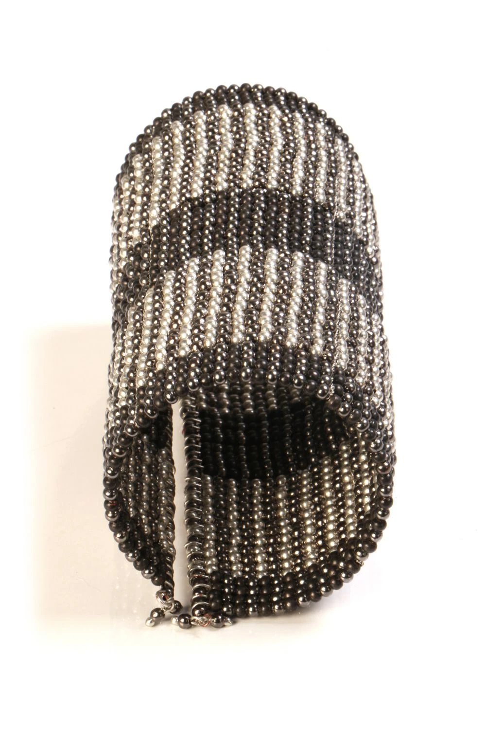 Accentuate your wrist with this chunky silver handcuff, assembled with silver & grey beads. You can style this statement piece with a breezy kaftan on your holiday.