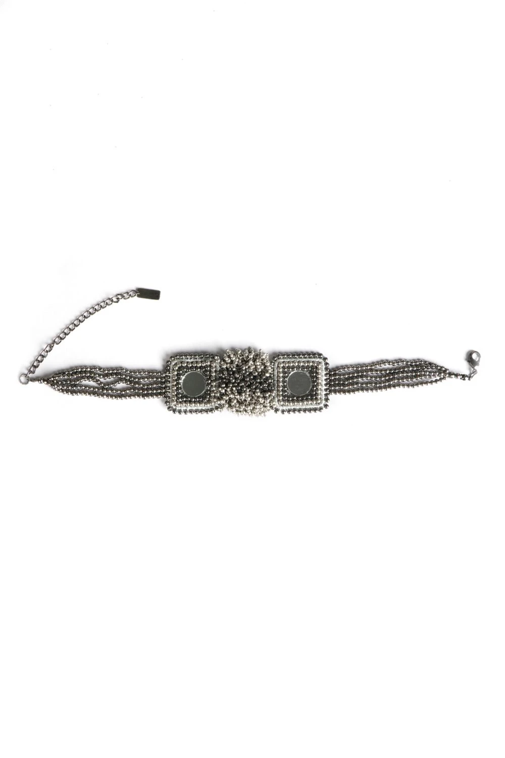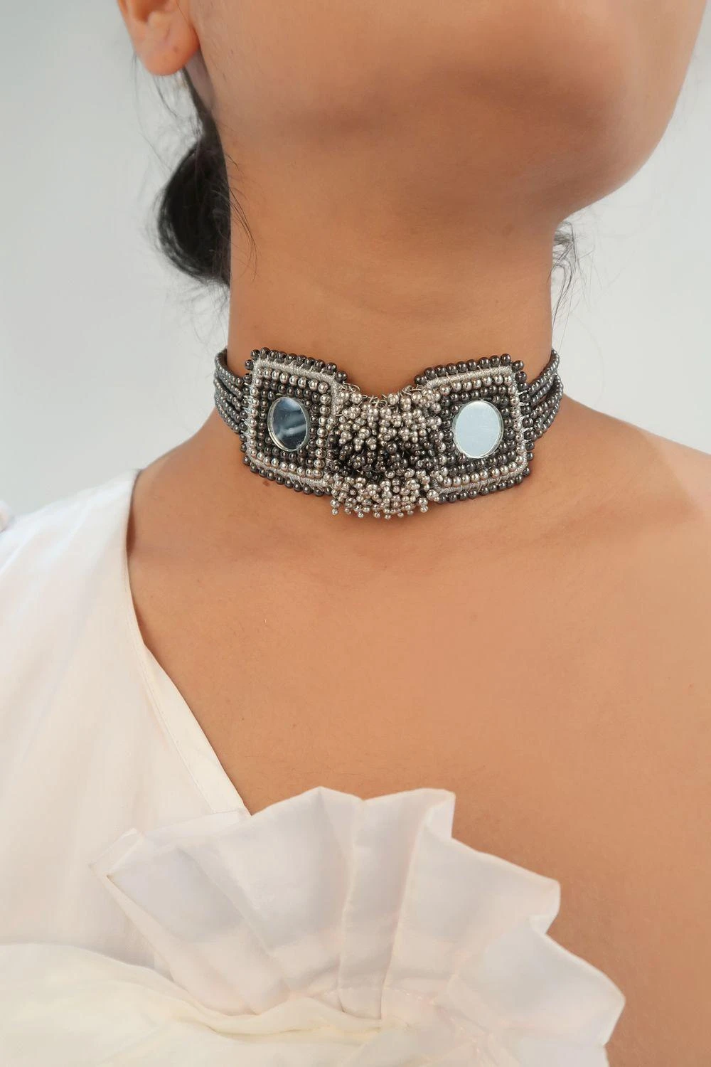 Enhance your festive looks with this statement silver choker made with mirrors and tiny metal beads, hanging in the center of the design which enhances the whole look.