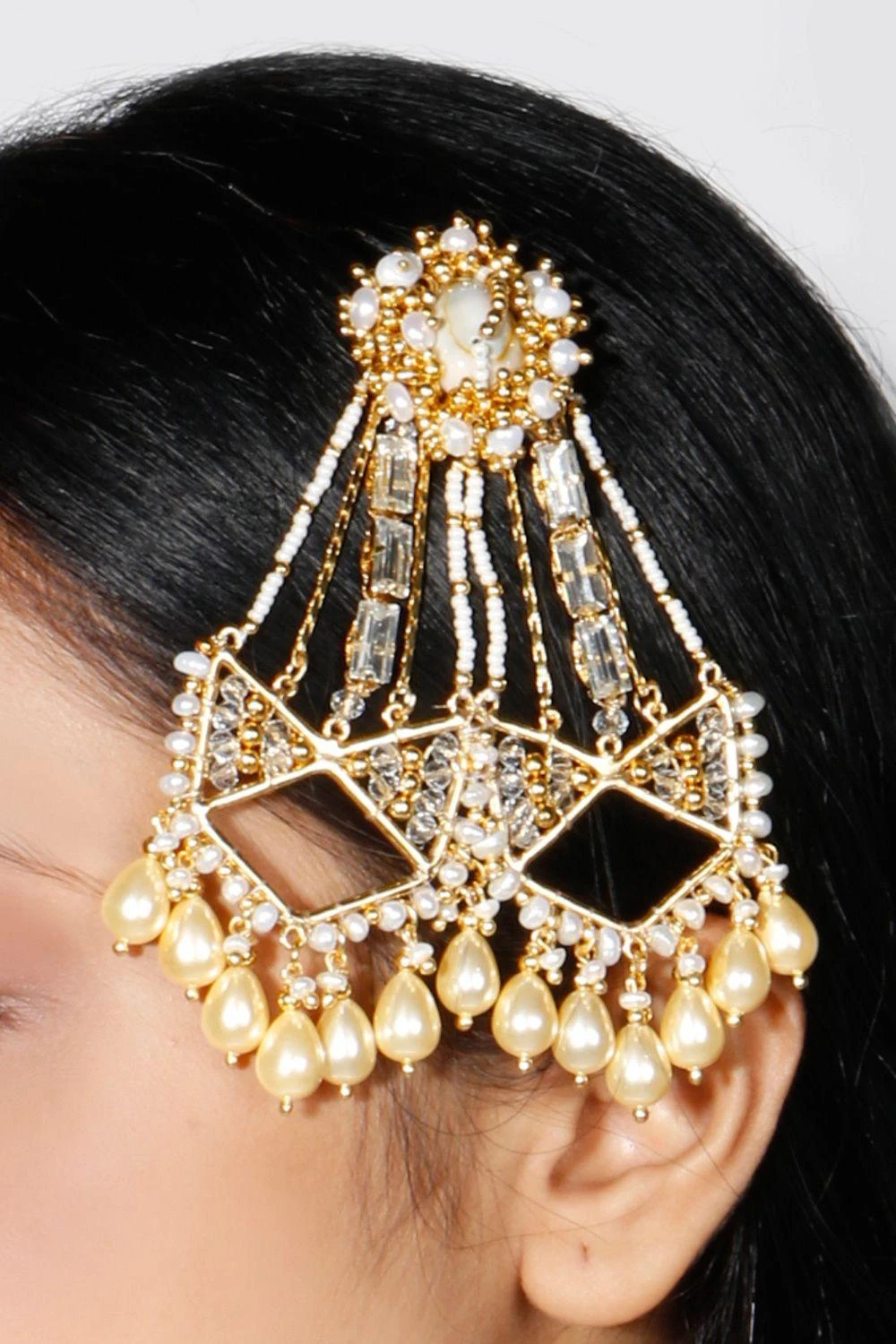 Spruce up your festive outfit with these gold finish pearl passa. A magnificent string of pearls, shell and stone chains and intricate zari work come together to complete the regal passa.