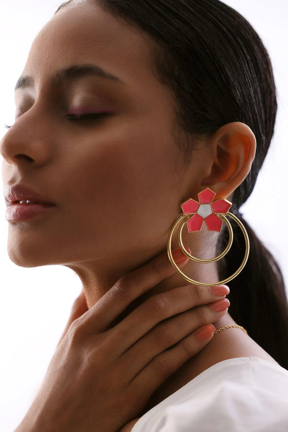 Experience the timeless allure of ‘Calendine’, a pair of earrings that flawlessly blend metal and enamel. Intricately crafted, these earrings exude elegance and sophistication.