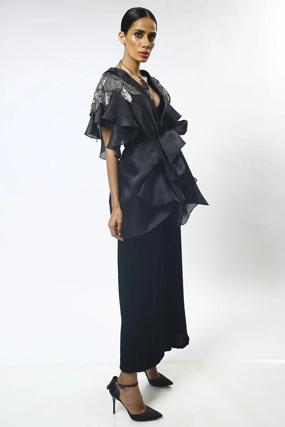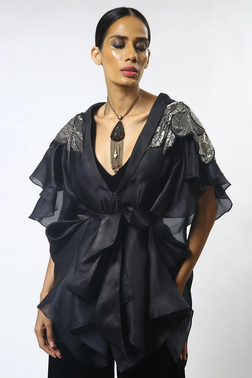 Material/Fabric : Cape- silk satin organza, pants & bustier- velvet