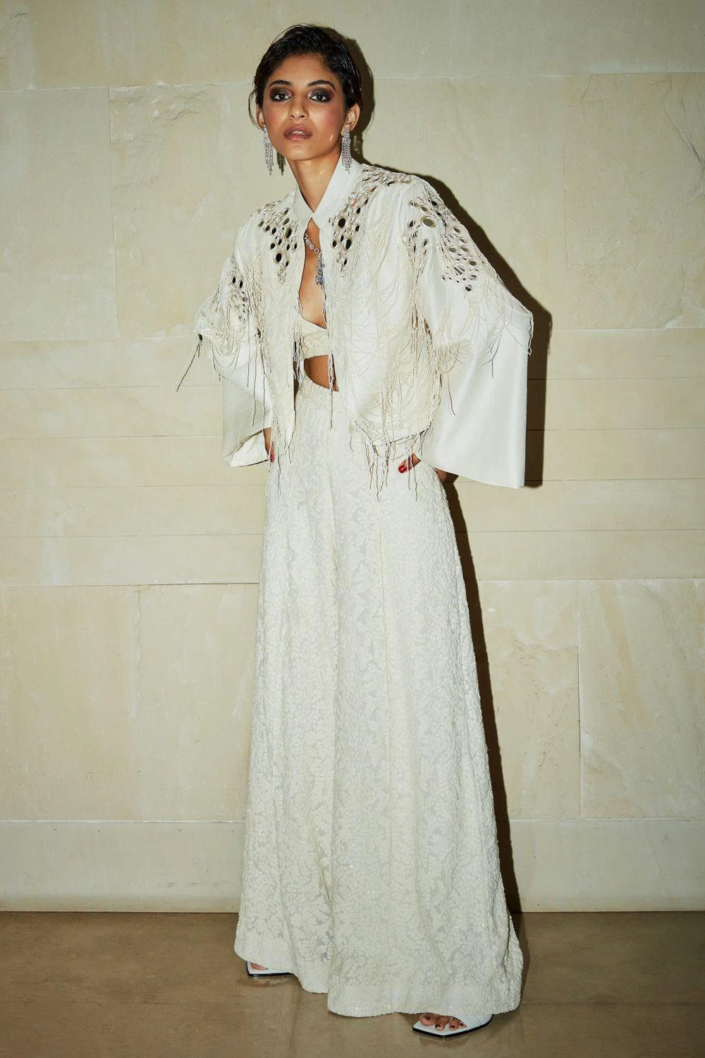 Spruce up your occasion wear with this eclectic & supremely stylish ivory jacket set. It features a pair of embroidered georgette trousers and a bustier elevated with a statement hand embroidered jacket. Add a pair of emeralds for a pop of colour.