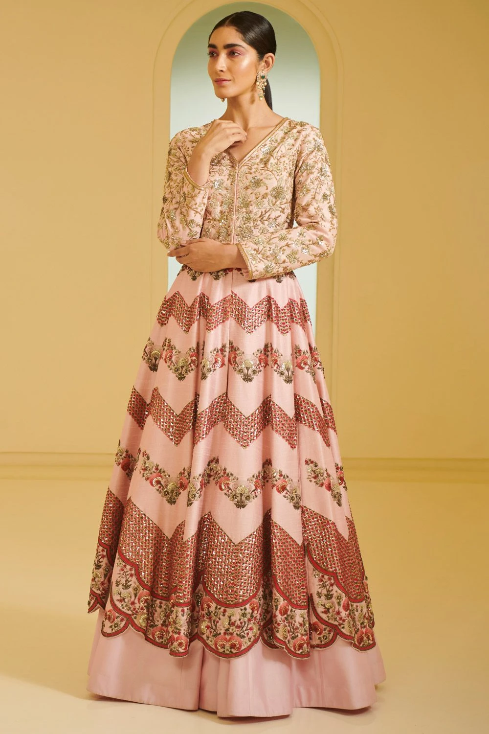 This dreamy light printed chevron anarkali is perfect for summer wedding events. This elegant piece is adorned with intricate resham thread embroidery & embellished with pearl, sequins & cutdana details.