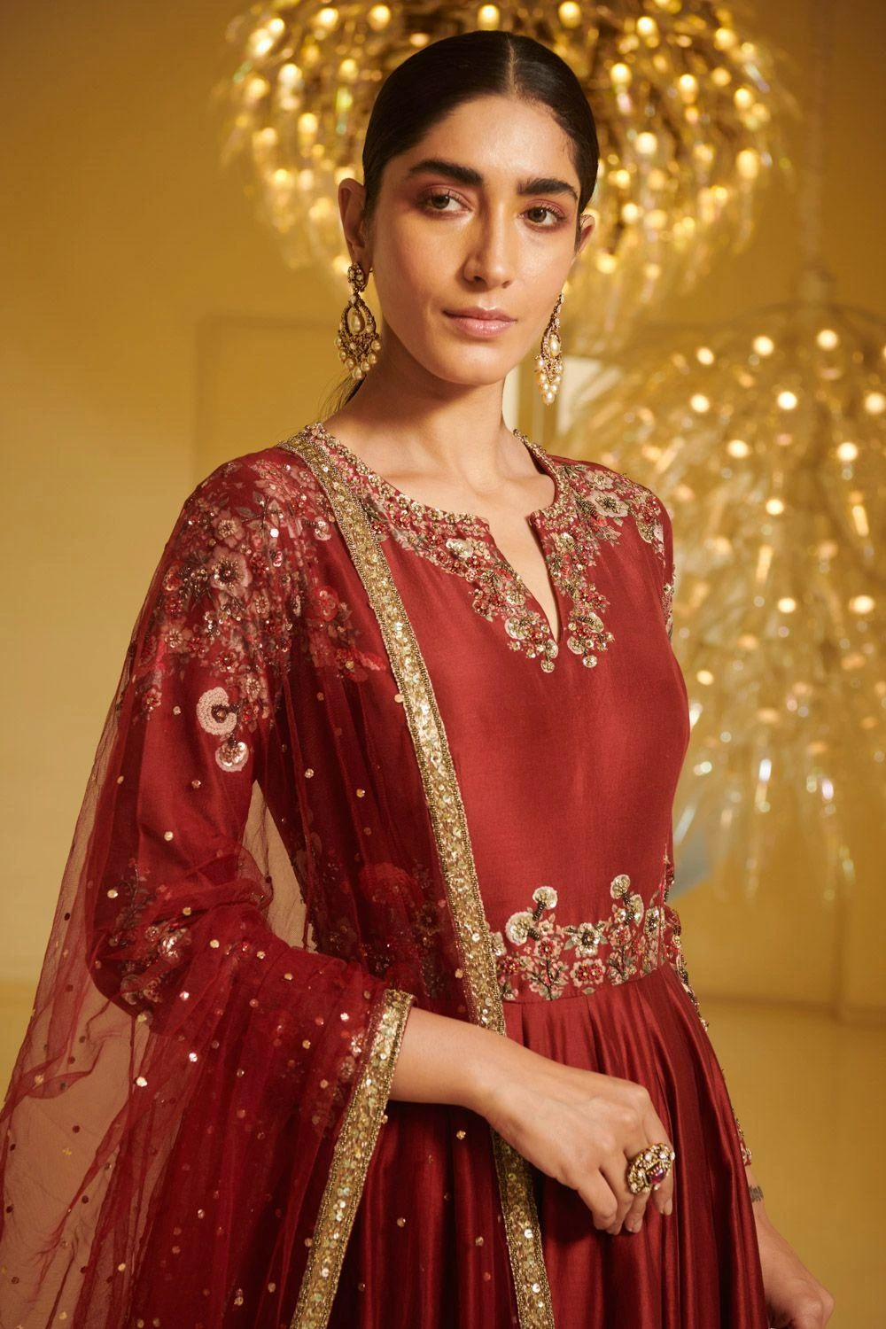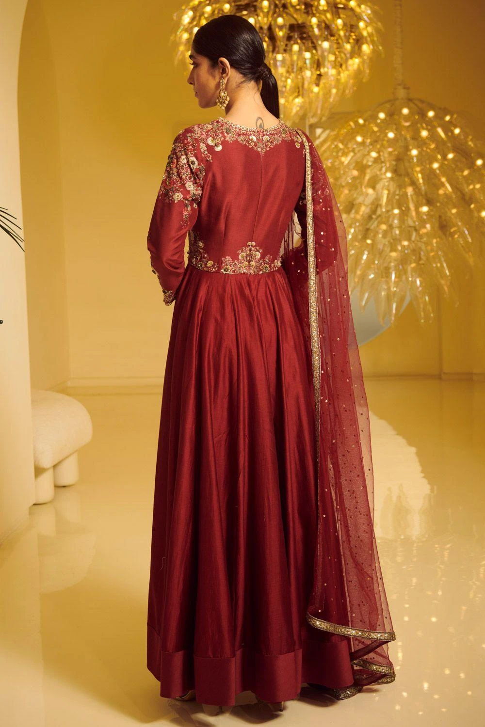 This maroon modal dupion anarkali exudes a regal aire. This classic set is adorned with resham thread embroidery & is embellished with pearl, sequins & cutdana embroidery.