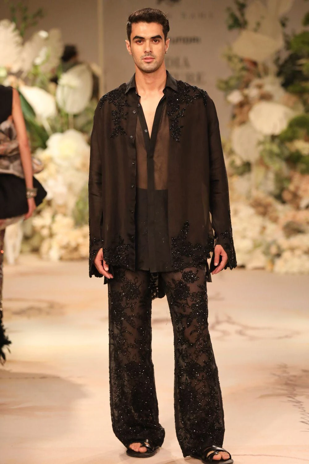 Elevate your style with a double-layered shirt and trouser set. Meticulously crafted, the embroidered shirt boasts intricate black cutdana and sequin work. Paired with matching black embroidered trousers, it leaves a striking impression.
