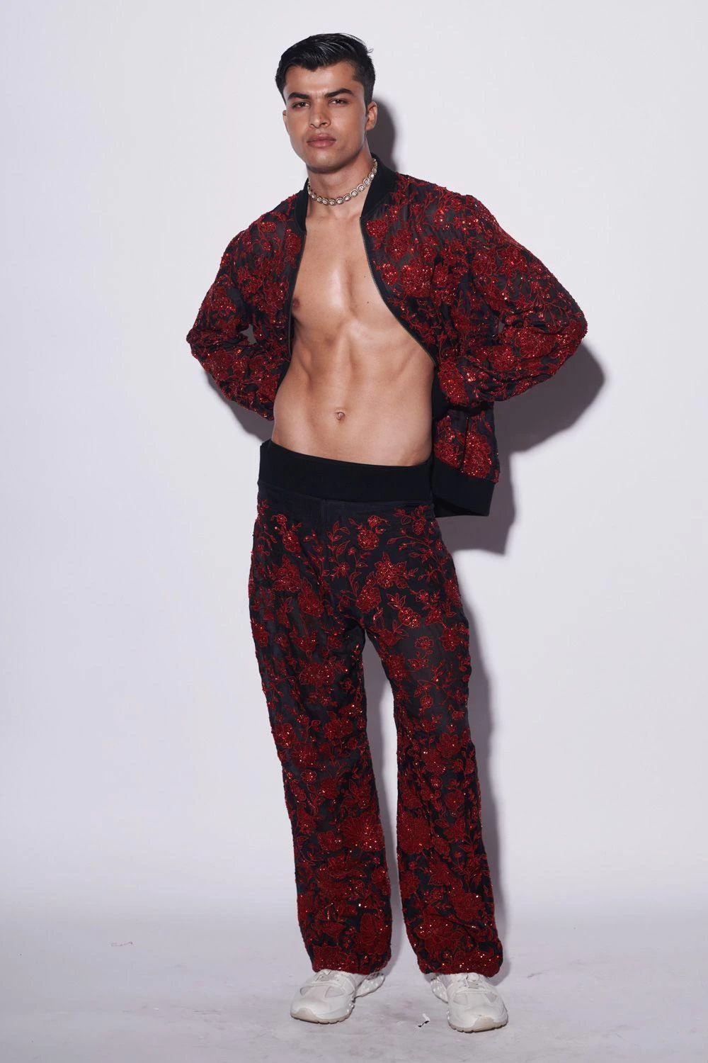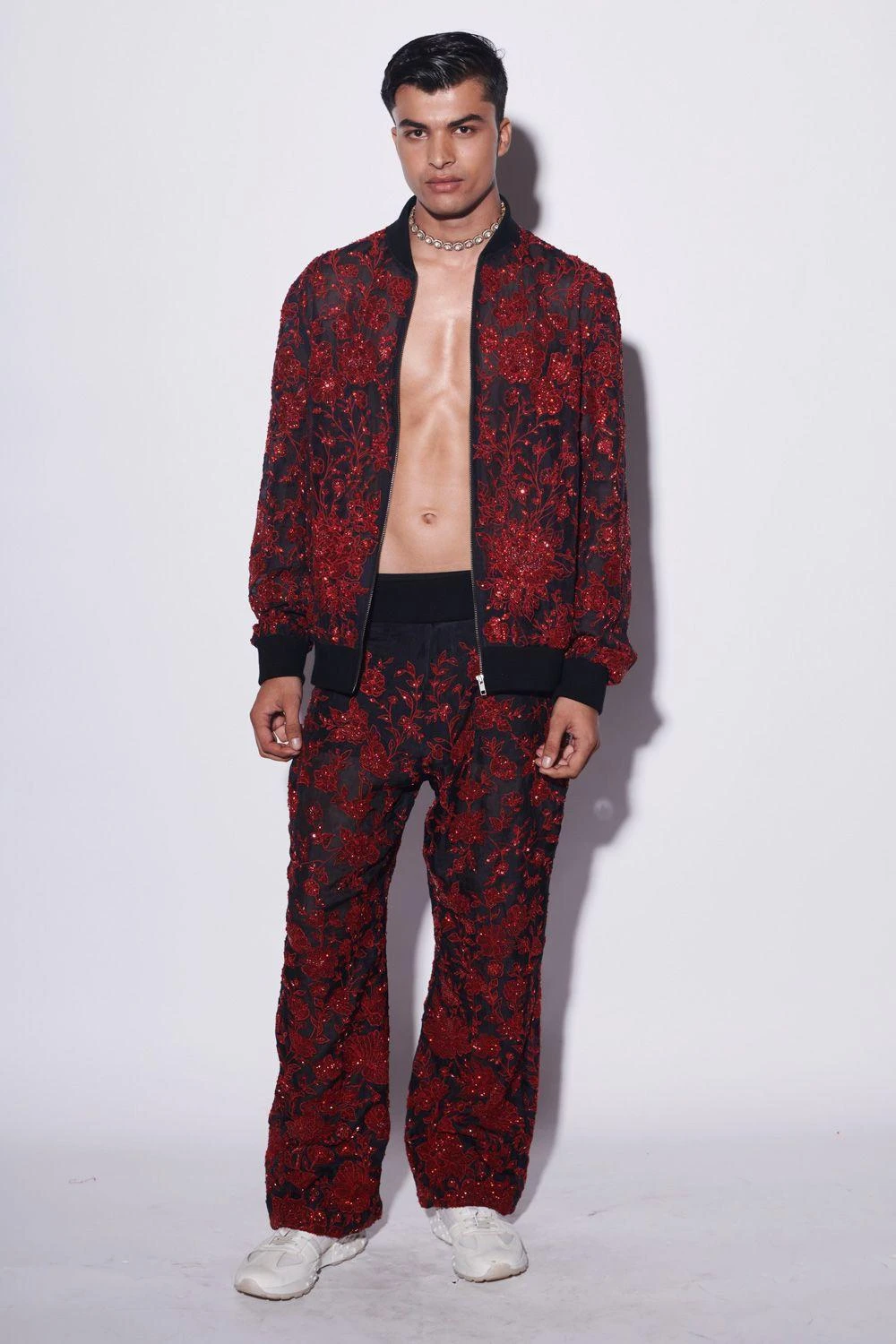 Look effortlessly stylish with this black bomber jacket and jogger set, meticulously hand-embroidered with red sequins and cutdana, yielding a subtle yet captivating sparkle on a striking black canvas.