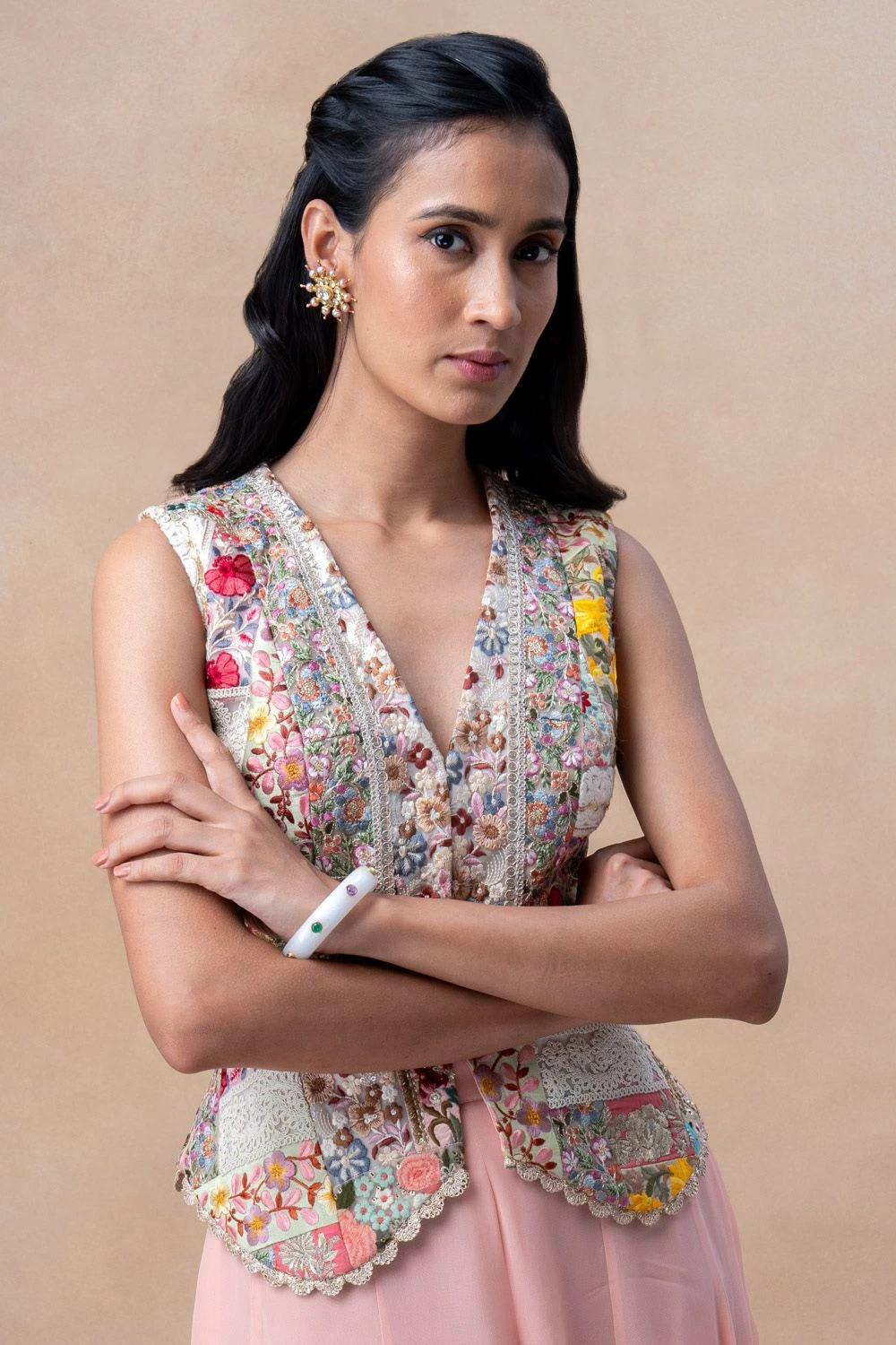The perfect amalgamation of style & comfort, this set works across occasions. Crafted in georgette, this jacket set features intricate embroidery with a delicate colour palette. It is a must-have addition to your wardrobe, embodying sophistication.