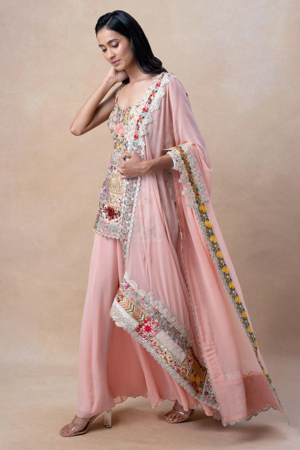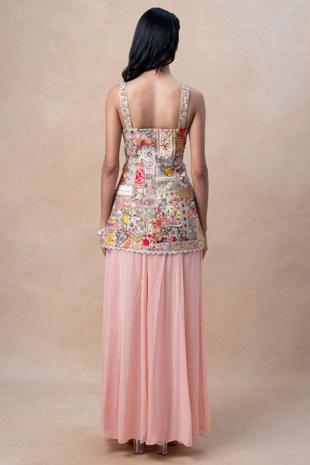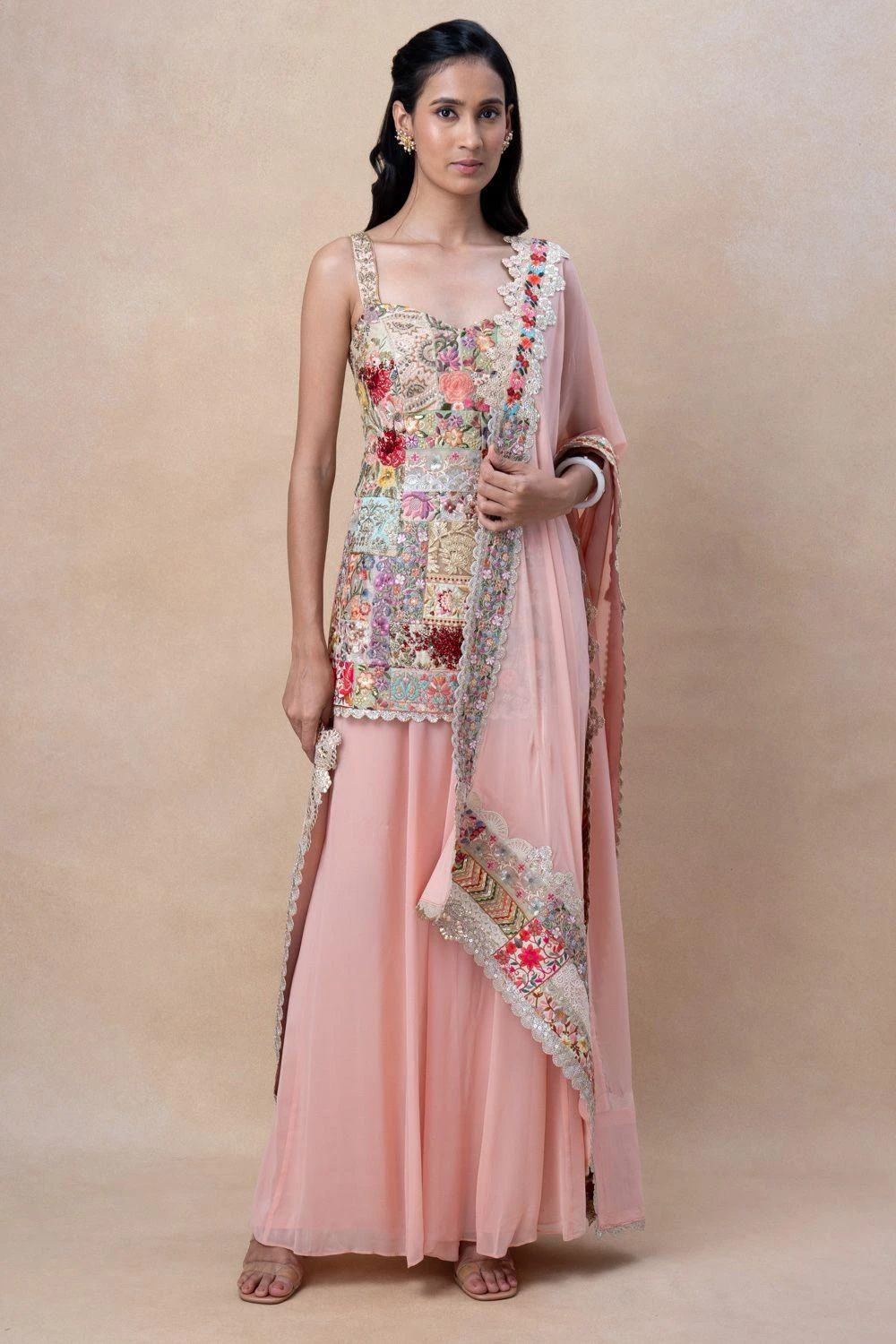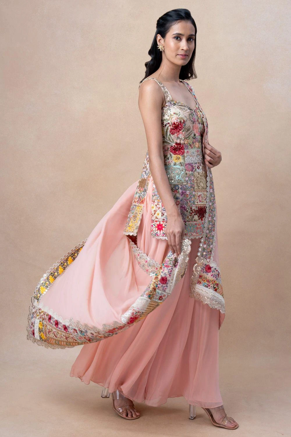 Indulge in sartorial opulence with this Embellished Sharara Set. Impeccably curated, this ensemble merges artisanal craftsmanship with a harmonious colour palette. Adorned with exquisite embellishments, it epitomizes elegance and finesse.