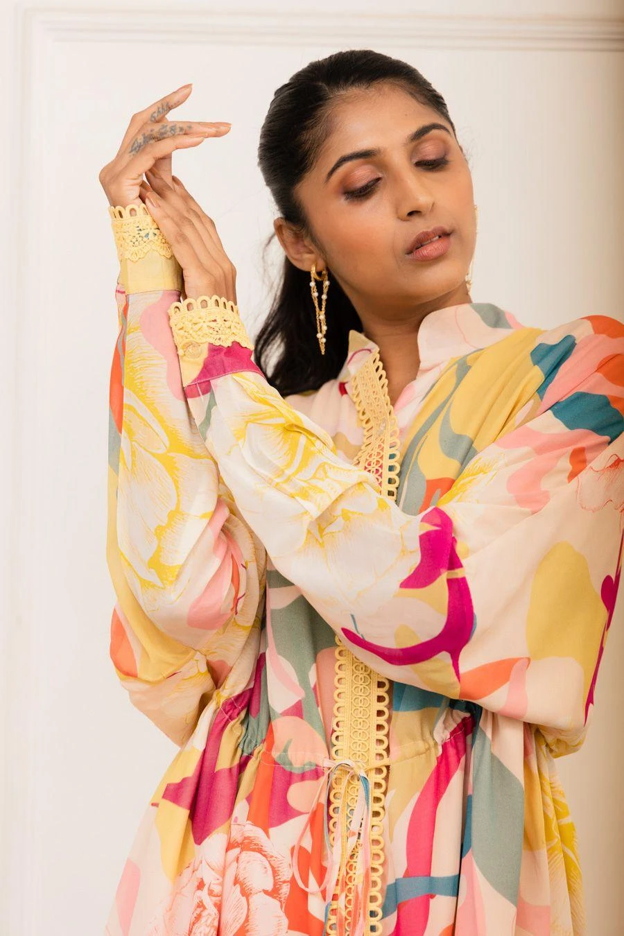 Add a layer of style & glamour to your resort getaways with this shirt dress. Crafted in georgette, this dress features a floral print a front button opening highlighted with lace detailing at the front and cuffs.