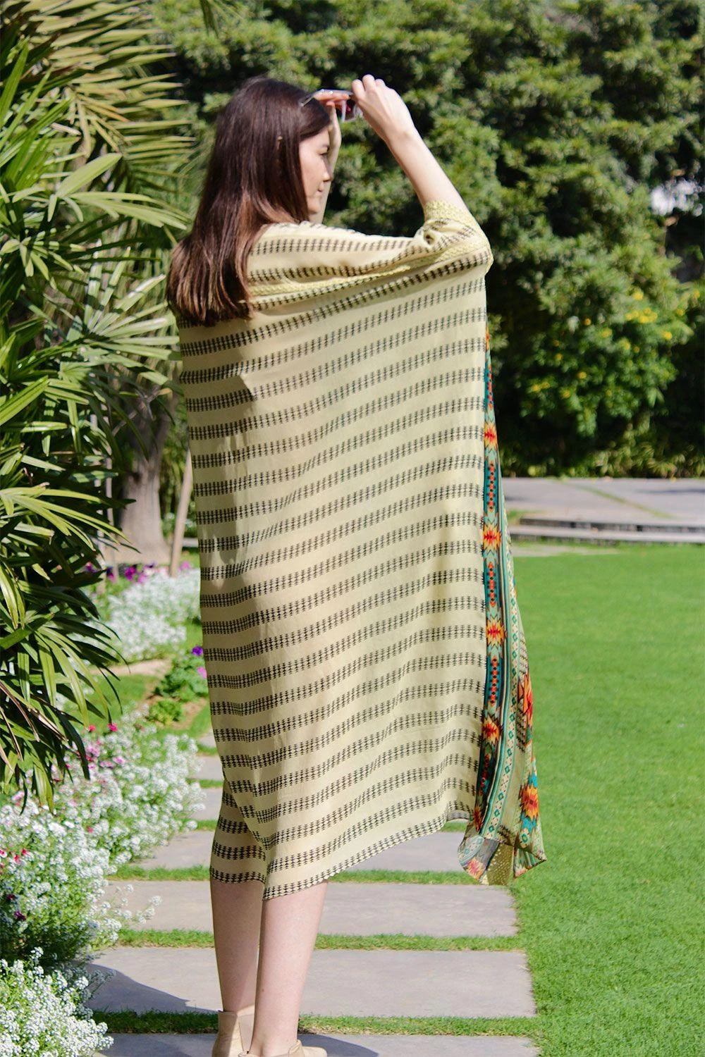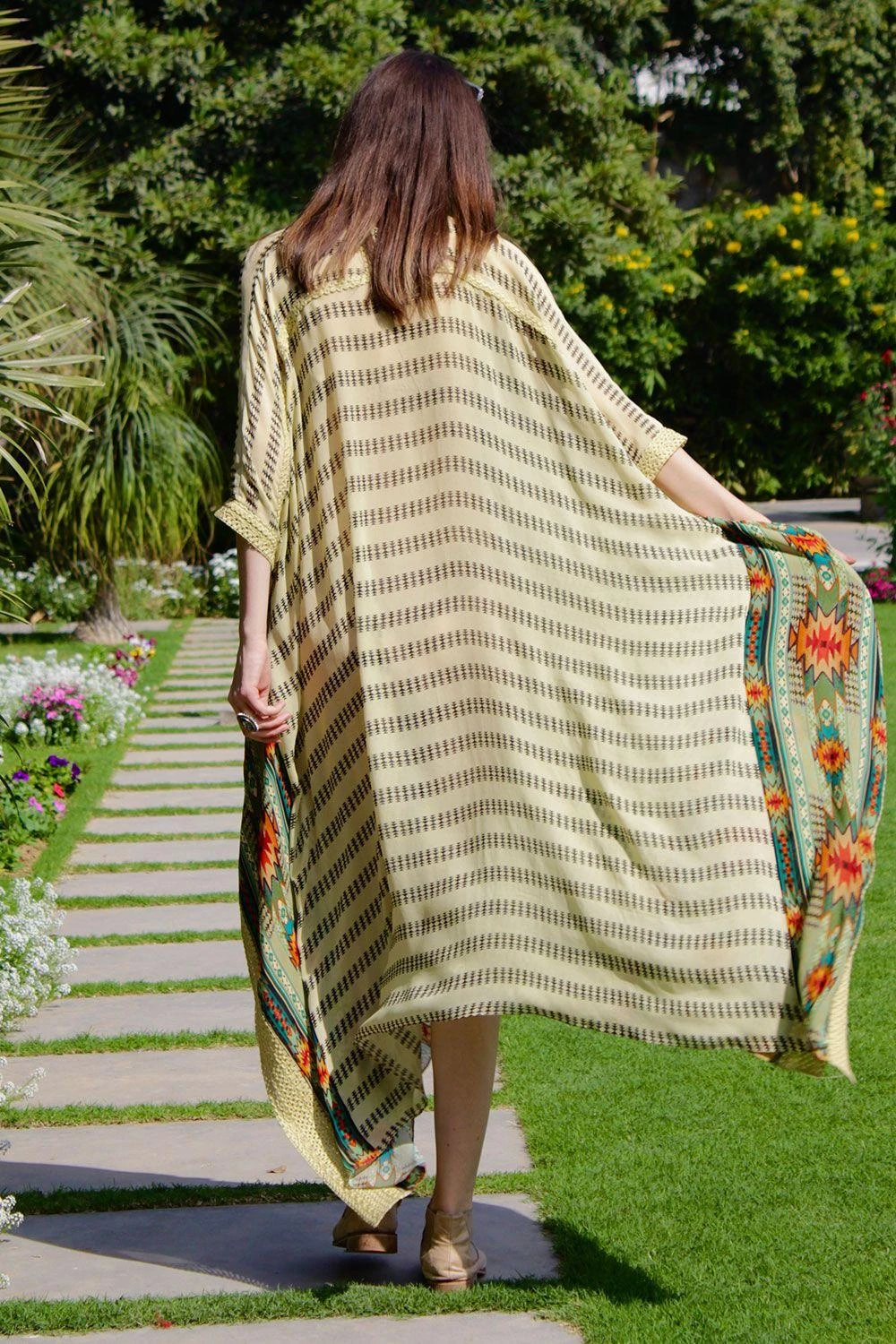 Relish your leisure time in style with this green kilim pattern kaftan. This knee length kaftan is woven in georgette with lace details. Style it with dangler earrings and a boho clutch.