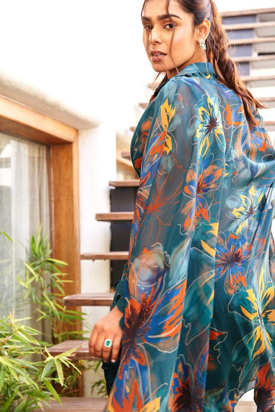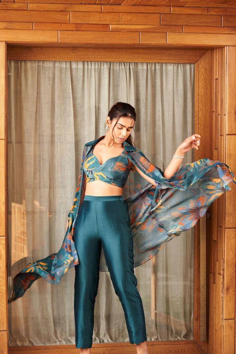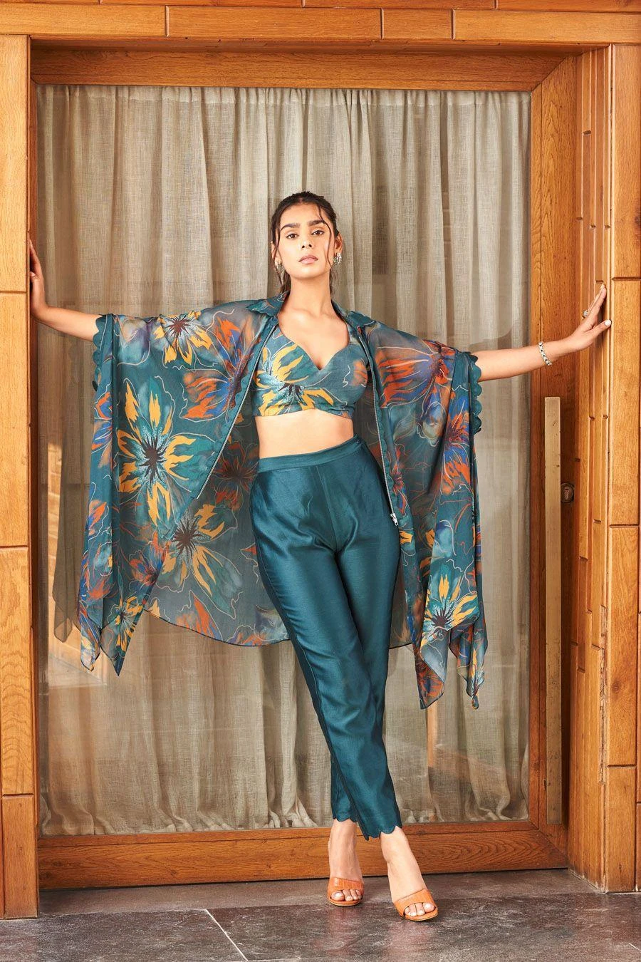 Add a layer of statement & glamour to your resort getaways with this cape set. Crafted in georgette& chanderi, this set features a floral printed zipper tunic paired with coordinating narrow bottoms.