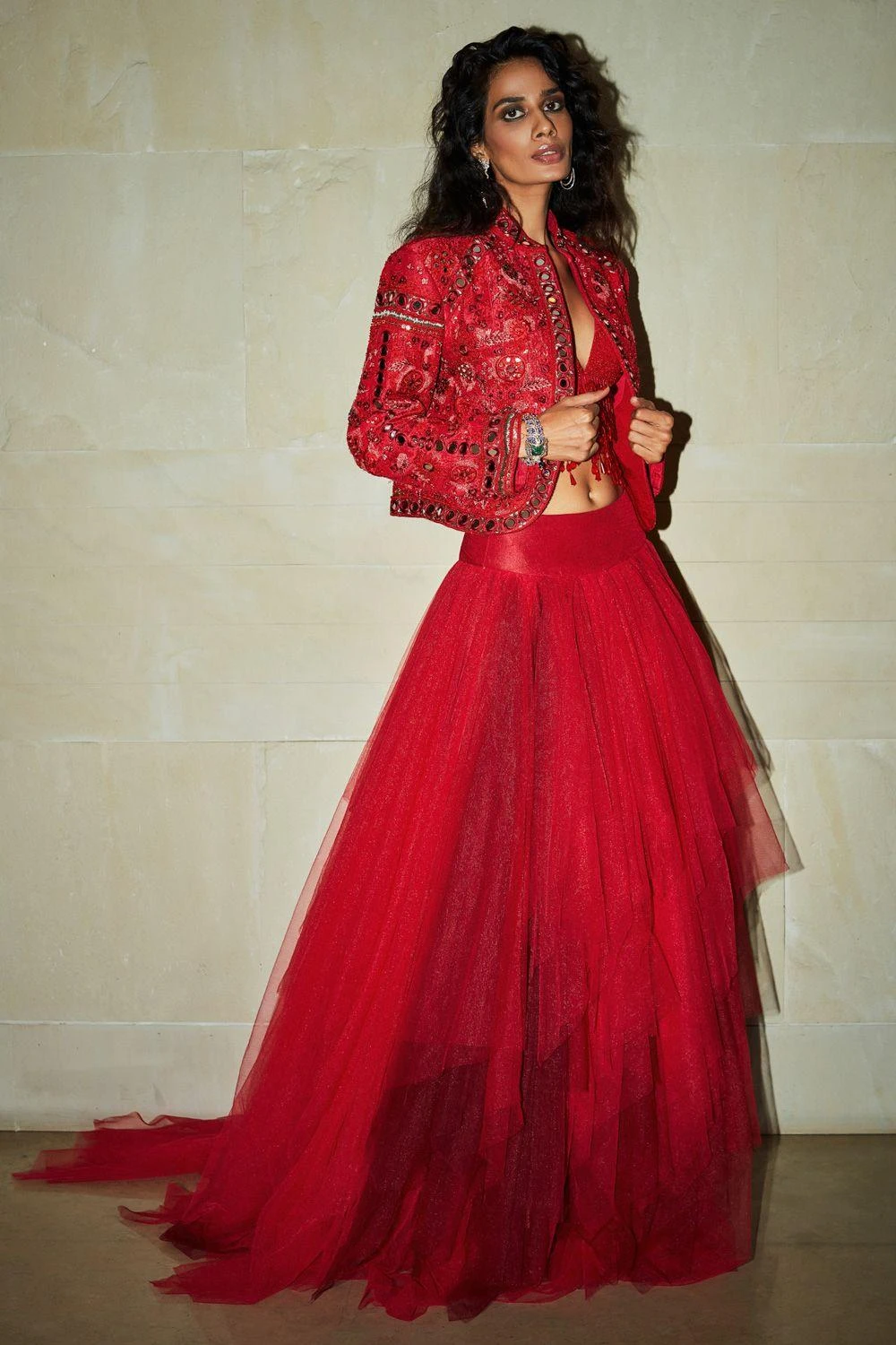 For the millennial brides, this ravishing ruby red lehenga set is perfect to shine in glamour & elegance. It features a draped tulle skirt complemented with a crystal gazing bustier and an embroidered statement jacket.