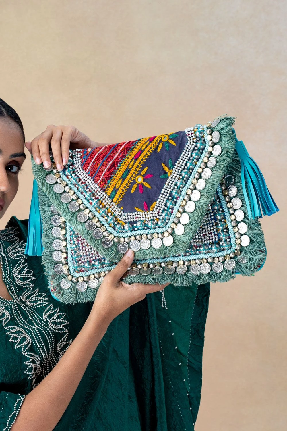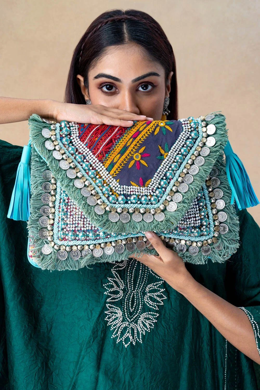 This embellished banjara envelope bag is adorned with colourful kutch embroidery. It has fringe details & a metallic button closure. Style this statement piece with Indian & contemporary looks with equal ease.