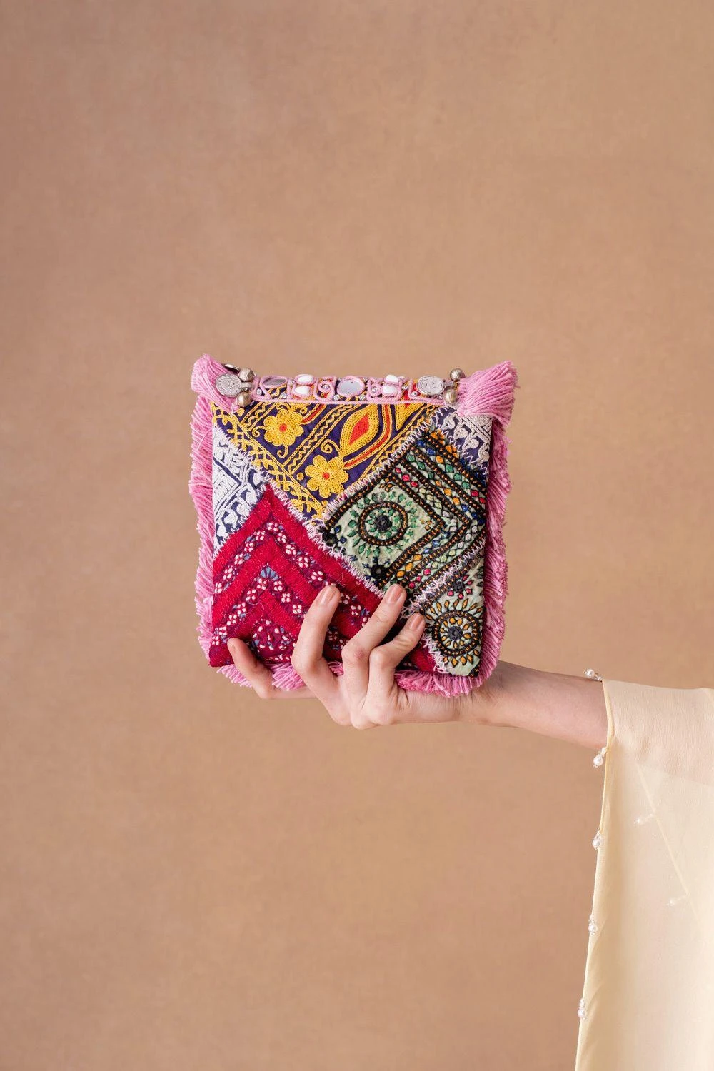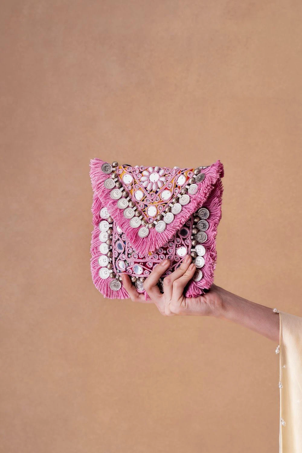 Unleash your free-spirited style with this pink mini banjara clutch! Adorned with sequins, tassels & intricate threadwork on vintage banjara fabric, it’s a bohemian dream. Pair it with flowy dresses or denim for an eclectic, festival-ready look!