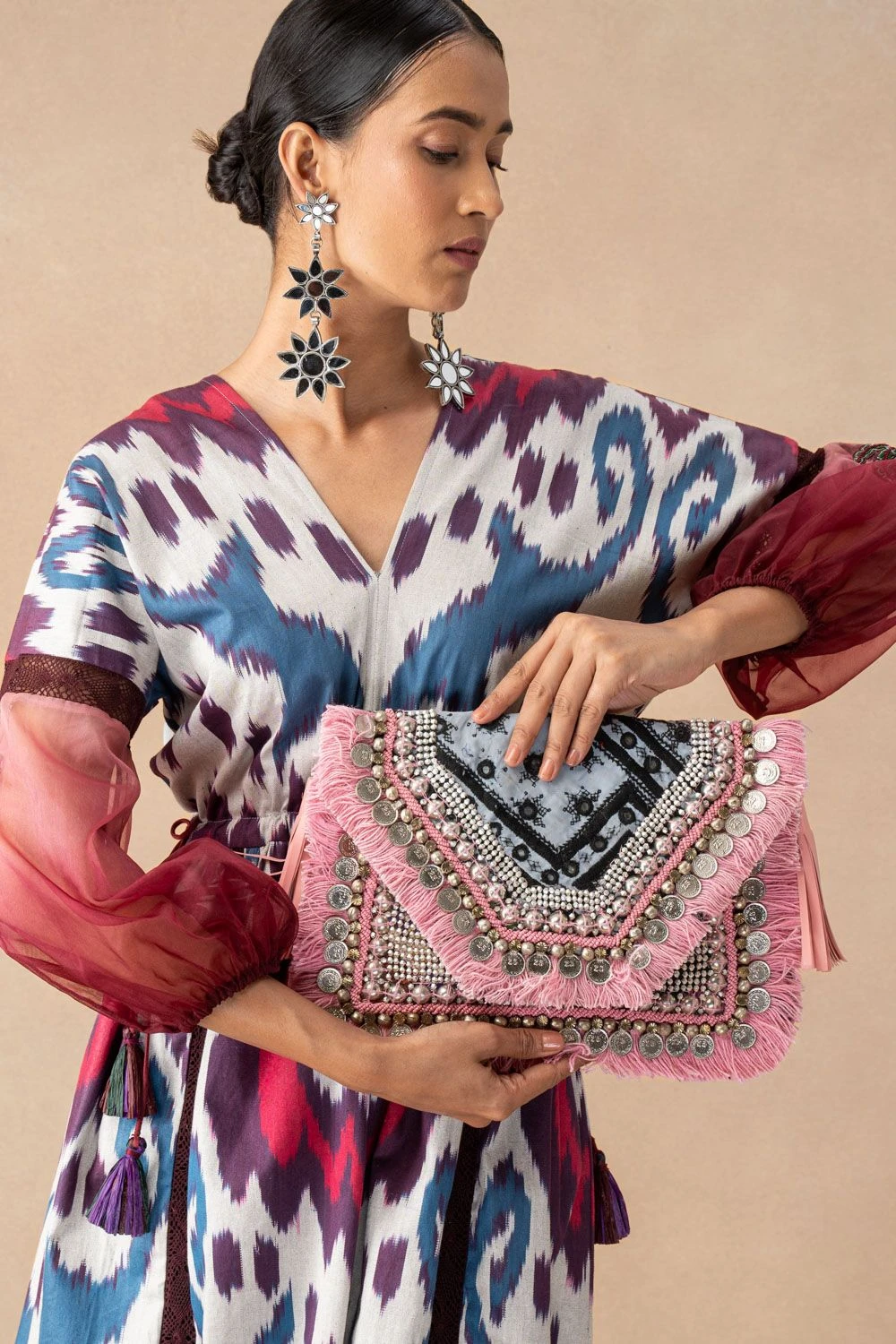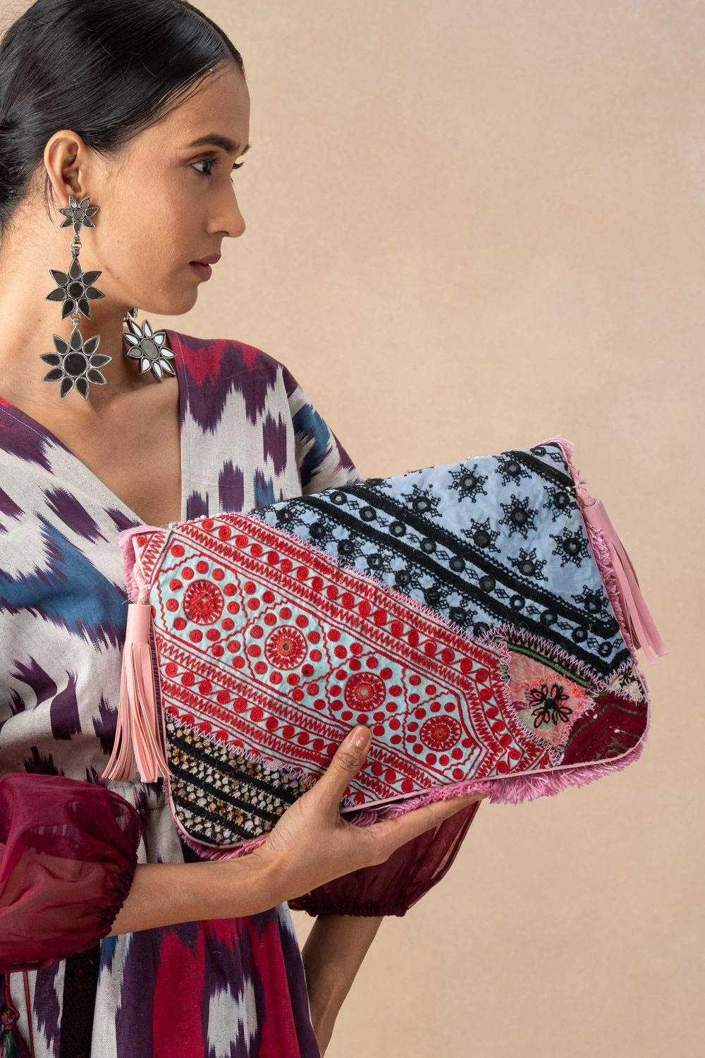This embellished banjara envelope bag is adorned with colourful kutch embroidery. It has fringe details & a metallic button closure. Style this statement piece with Indian & contemporary looks with equal ease.