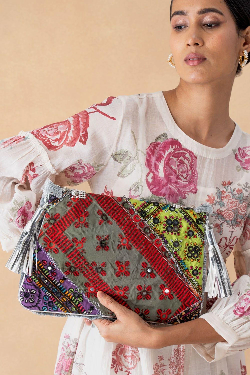 Exude free-spirited charm with this silver banjara clutch, adorned with sequins, tassels, coins & vintage threads on vintage fabric base. Pair it with a flowy maxi dress or distressed denim for an eclectic, boho-chic vibe.