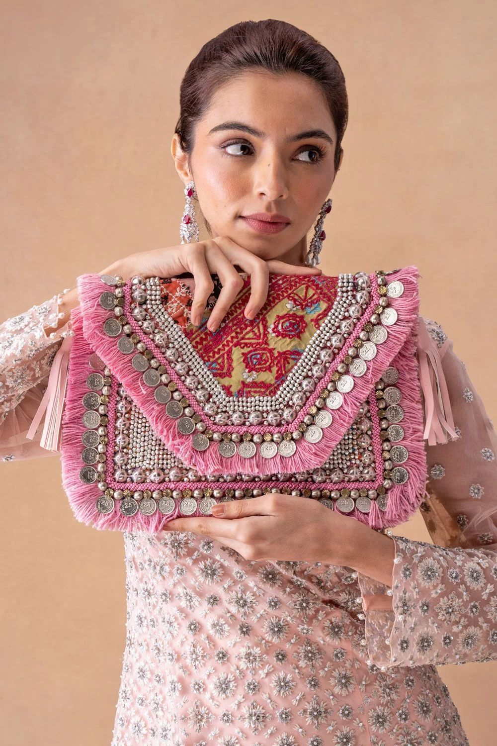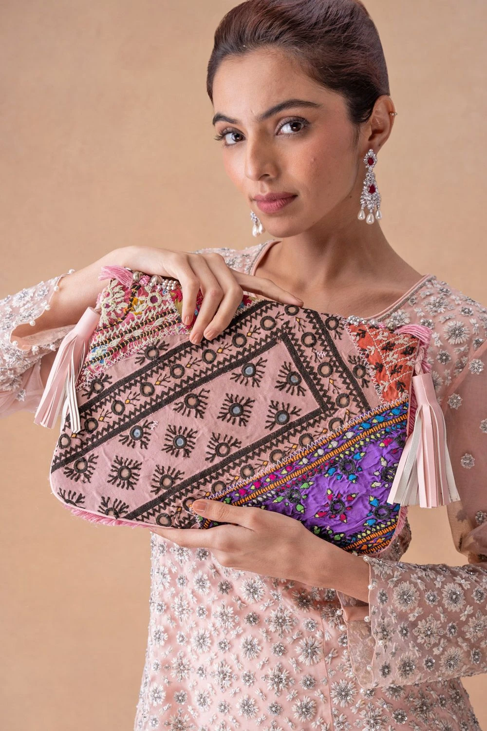 Indulge in free-spirited elegance with this shell pink banjara clutch. Adorned with sequins, tassels & vibrant threads on banjara fabric, it’s a chic statement piece. Pair it with a flowing maxi dress for an eclectic, boho-chic vibe.