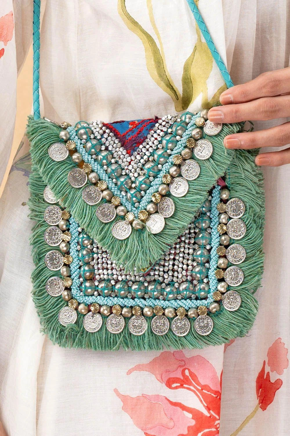 Add a bohemian flair to your holiday looks with this chic minion clutch. It is handcrafted in vintage banjara fabric and adorned with coinwork, beads & tassels. Style it with a breezy kaftan or a dress.