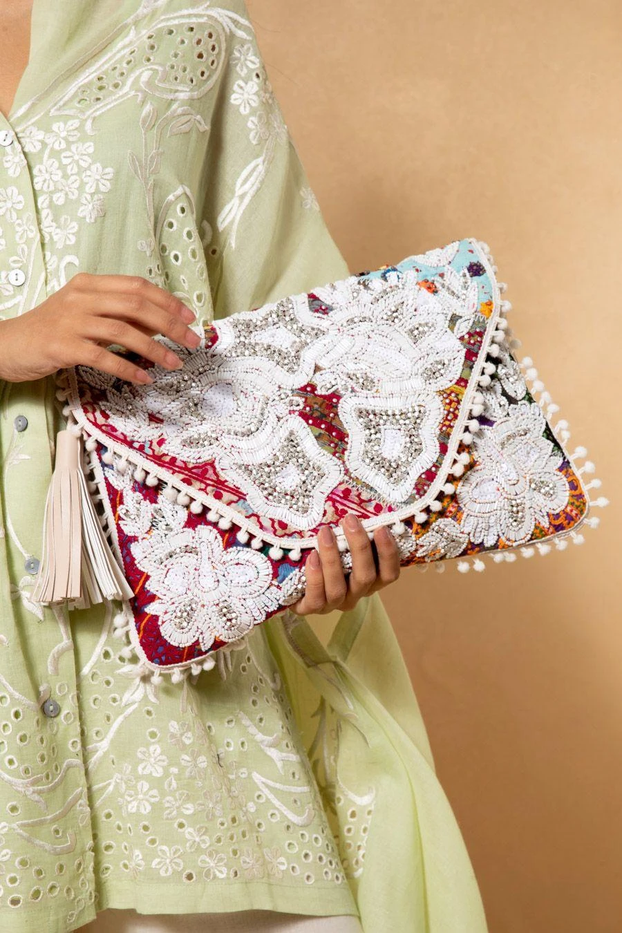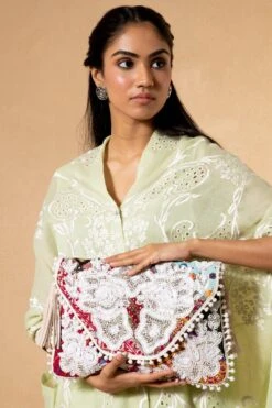 This embellished banjara envelope bag is adorned with colourful kutch embroidery. It has fringe details & a metallic button closure. Style this statement piece with Indian & contemporary looks with equal ease.