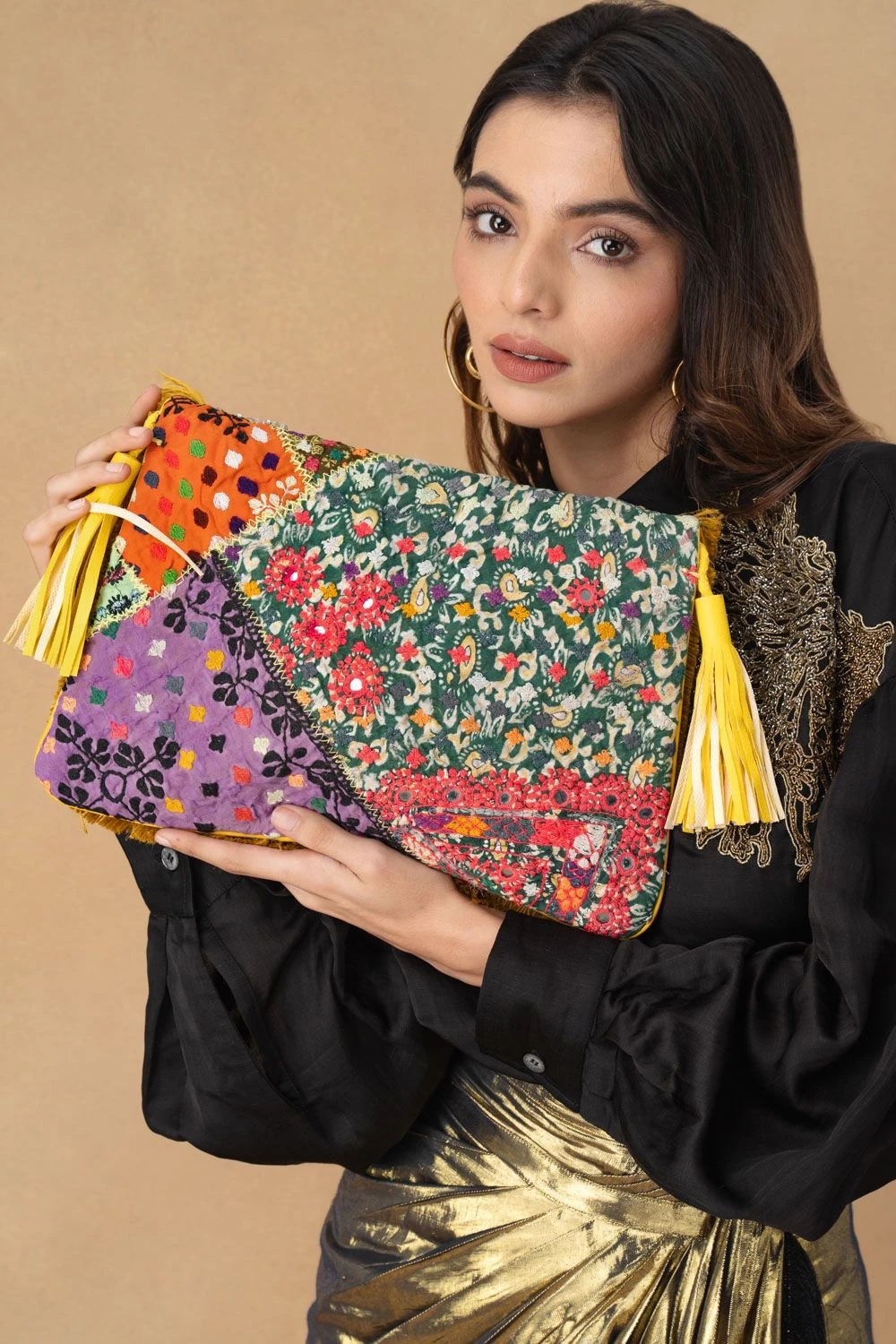 This embellished banjara envelope bag is adorned with colourful kutch embroidery. It has fringe details & a metallic button closure. Style this statement piece with Indian & contemporary looks with equal ease.
