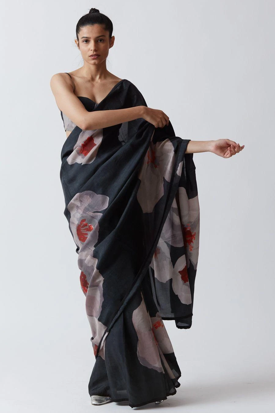 Crafted in pure linen, the strappy blouse features white poppied printed all over. Style it with the Black azu silk sari & a pair of statement earrings to complete the look.