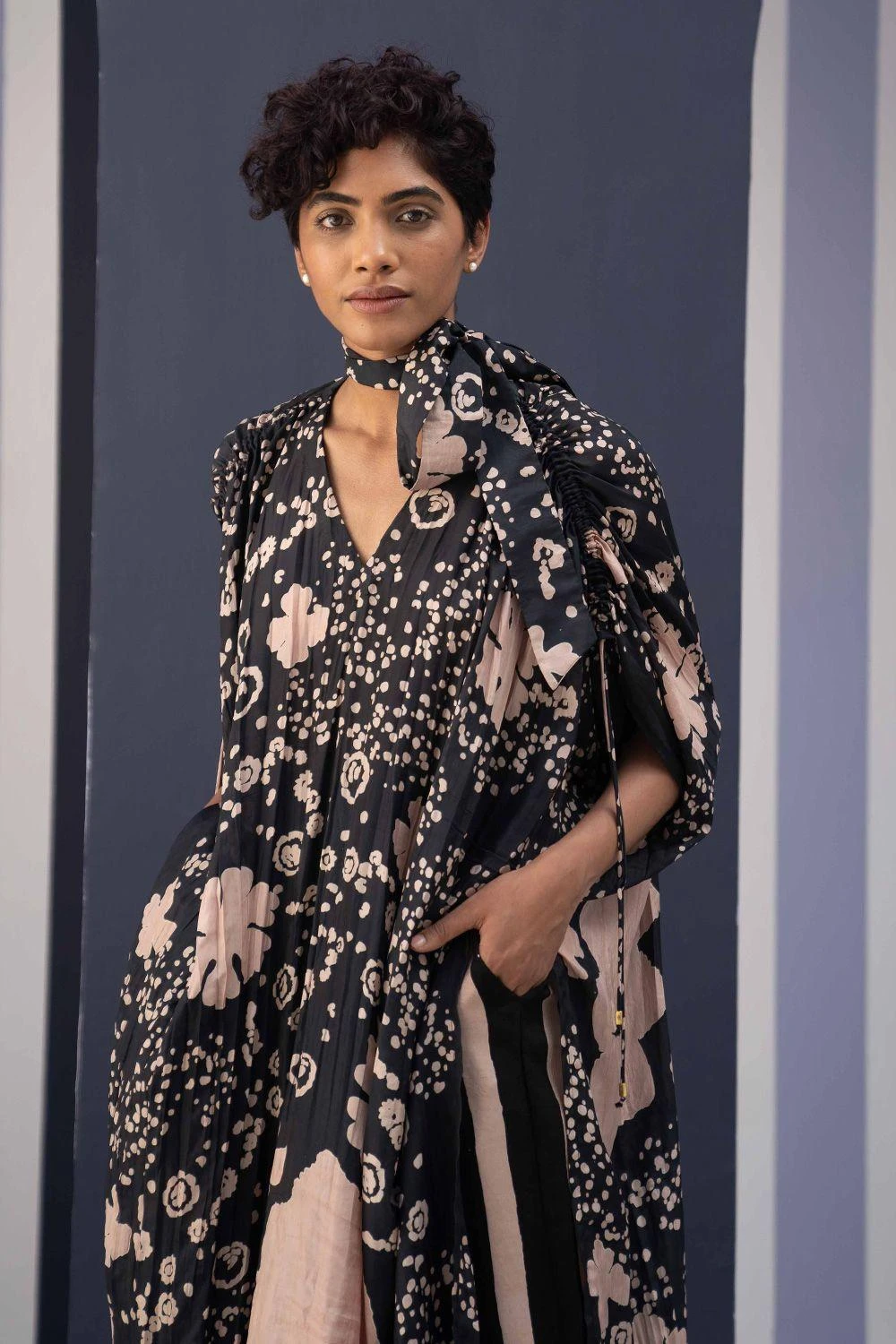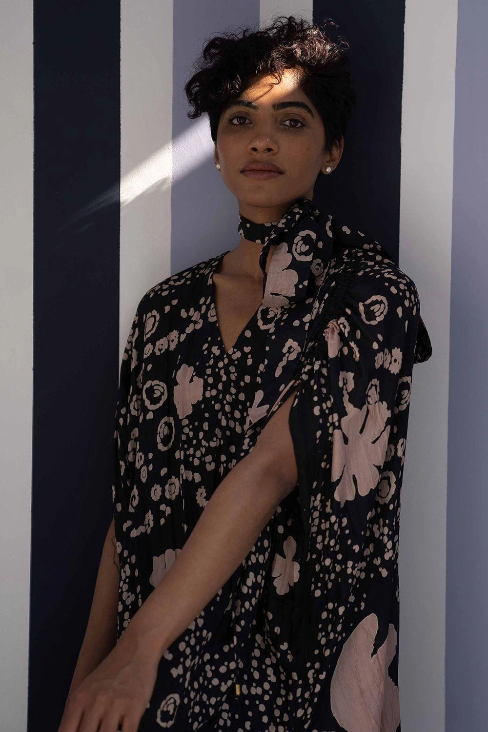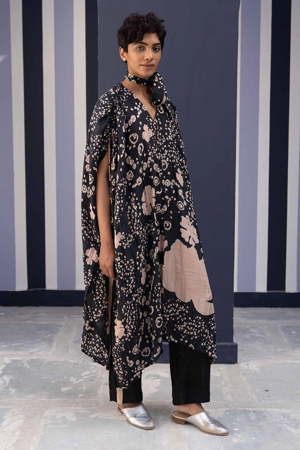 This kaftan set is suitable for every mood and occasion. Cut in crepe, this set includes a kaftan and pants, and features a massive handblock printed lotus and seaside motifs. Style this set with a stack of bracelets & heels.