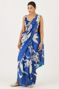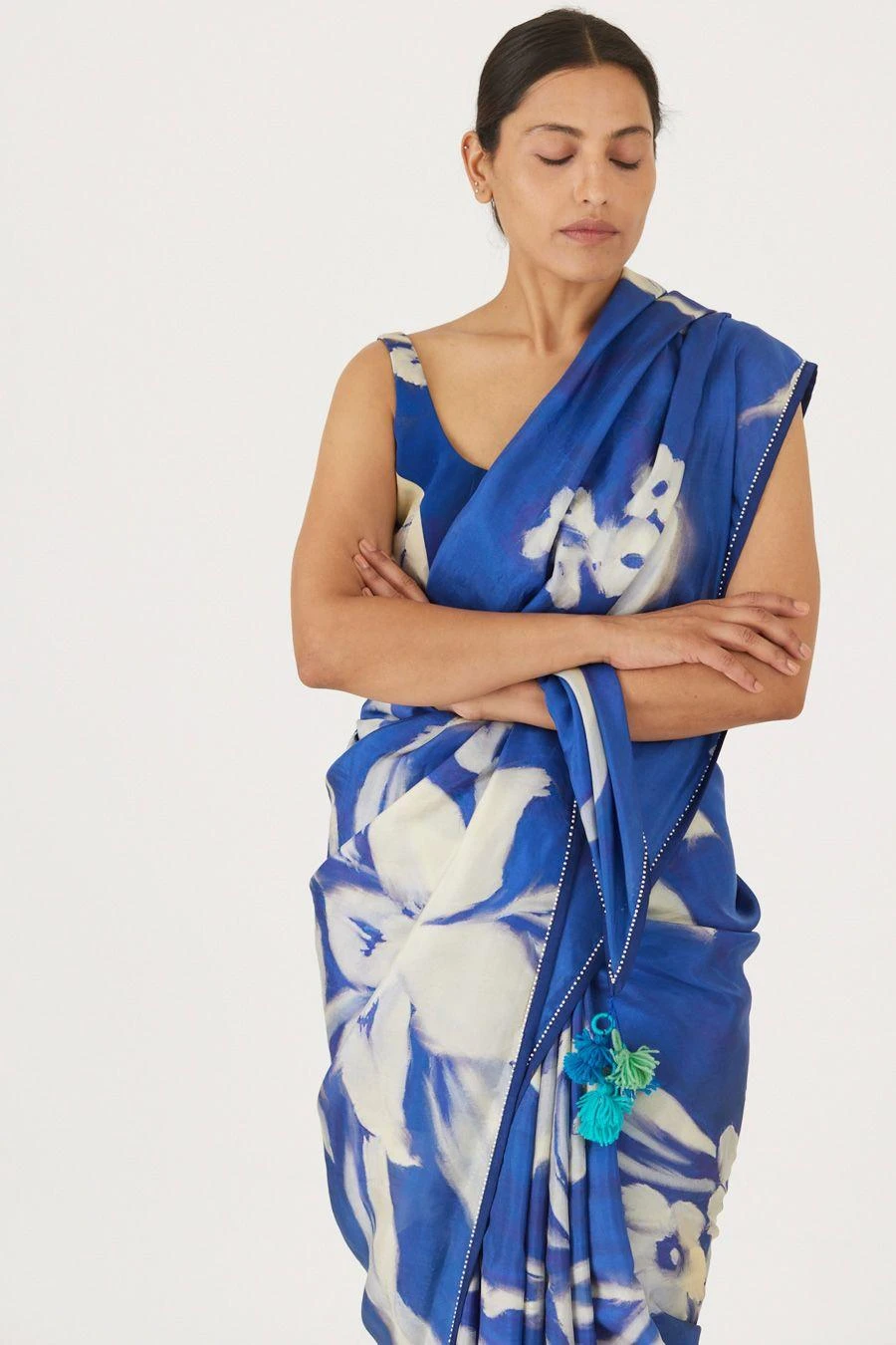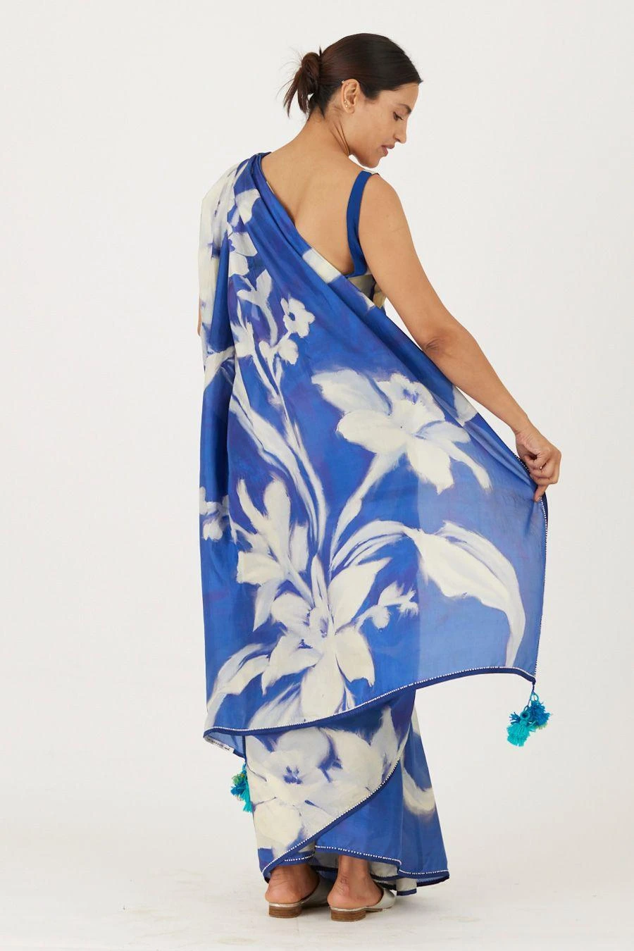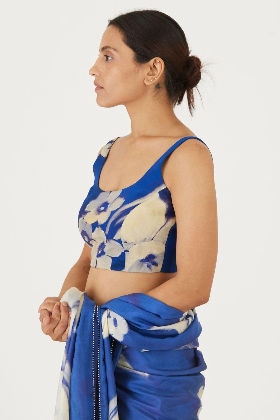 Crafted in crepe, handpainted & printed florals with vines & small rosettes adorn this blouse in blue hues. Style it with the Chicory white poppies sari & a pair of statement earrings to complete the look.