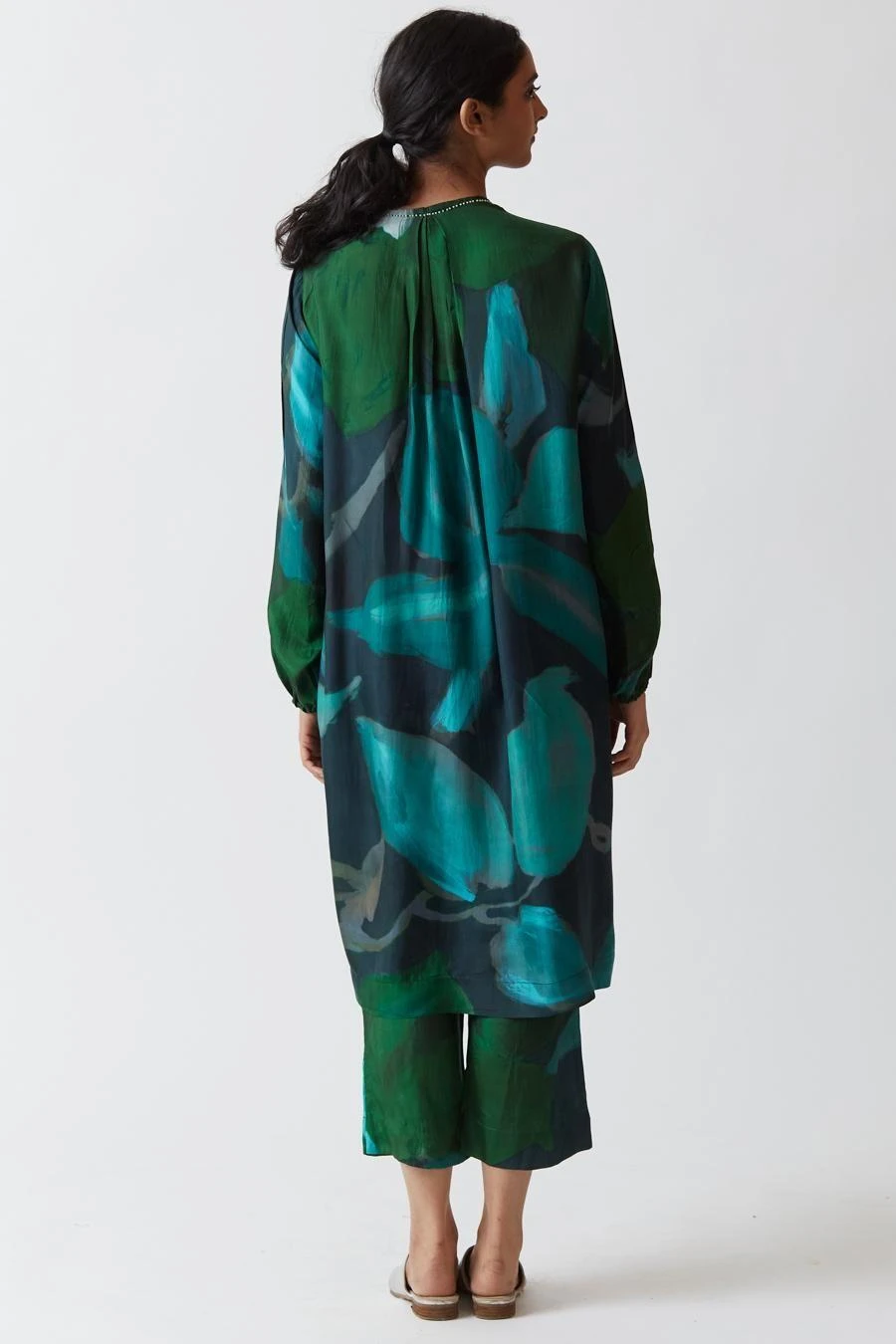 This kurta set falls in the realm of luxe minimalism. Crafted in pure silk, hand-painted & printed florals with vines & small rosettes along with beadwork adorn this forest green kurta set. Style it with a stack of bracelets to complete the look.