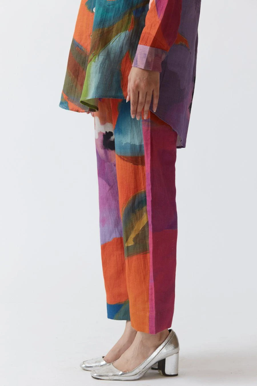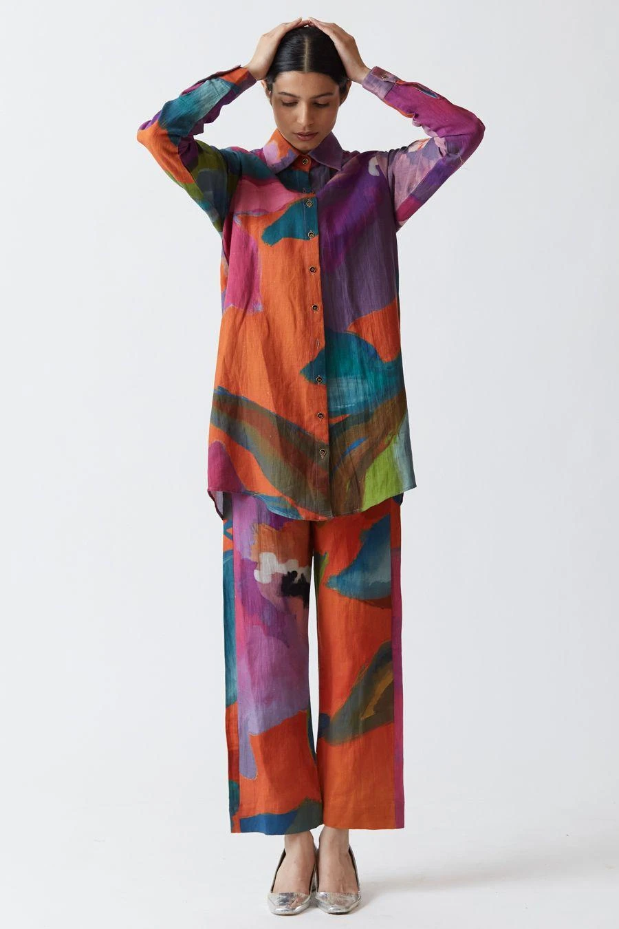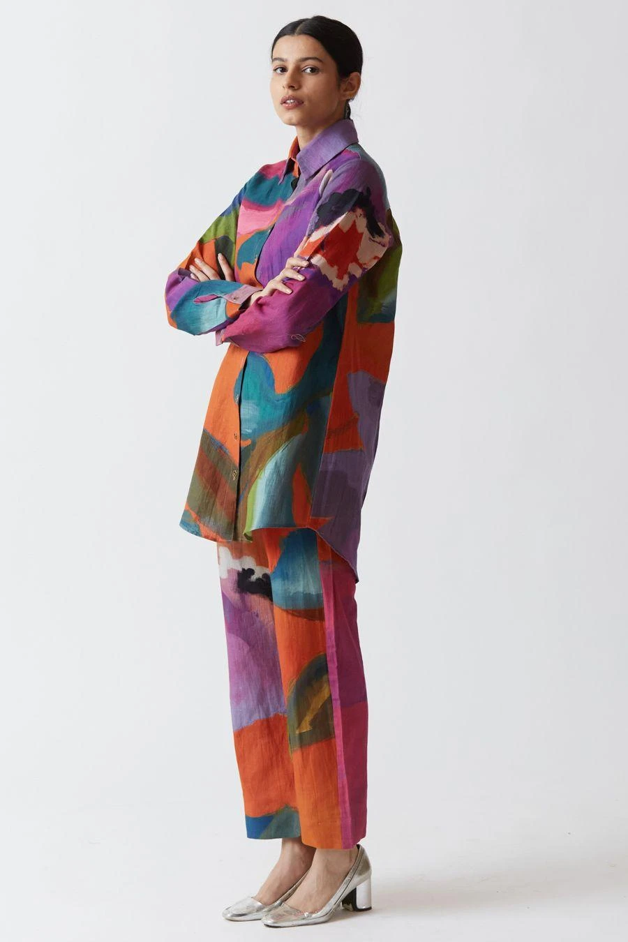 This co-ord set falls in the realm of luxe minimalism. Crafted in linen, handpainted and printed florals with vines and small rosettes adorn this print in bright orange and rani pink hues. Style it with a stack of bracelets to complete the look.